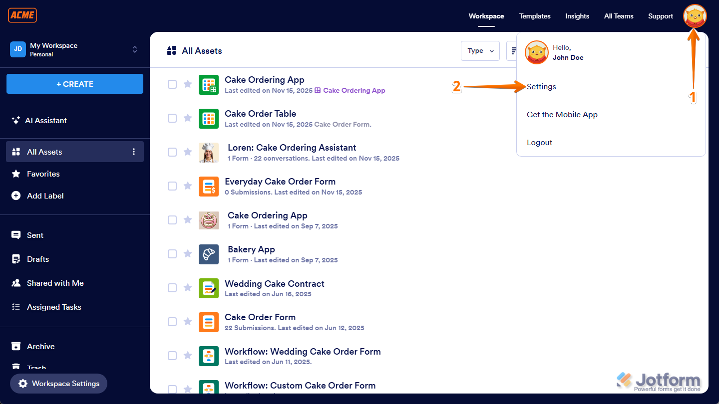- On your Workspace page, click on Type at the top, and in the Dropdown menu that opens, uncheck the boxes next to all the assets except Forms, so only they’ll be shown on the page.
