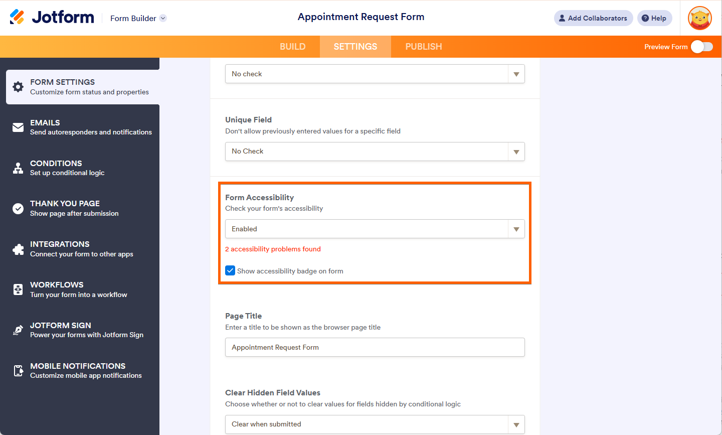 - Scroll down and look for the Form Accessibility option and select Enabled from the dropdown list.
