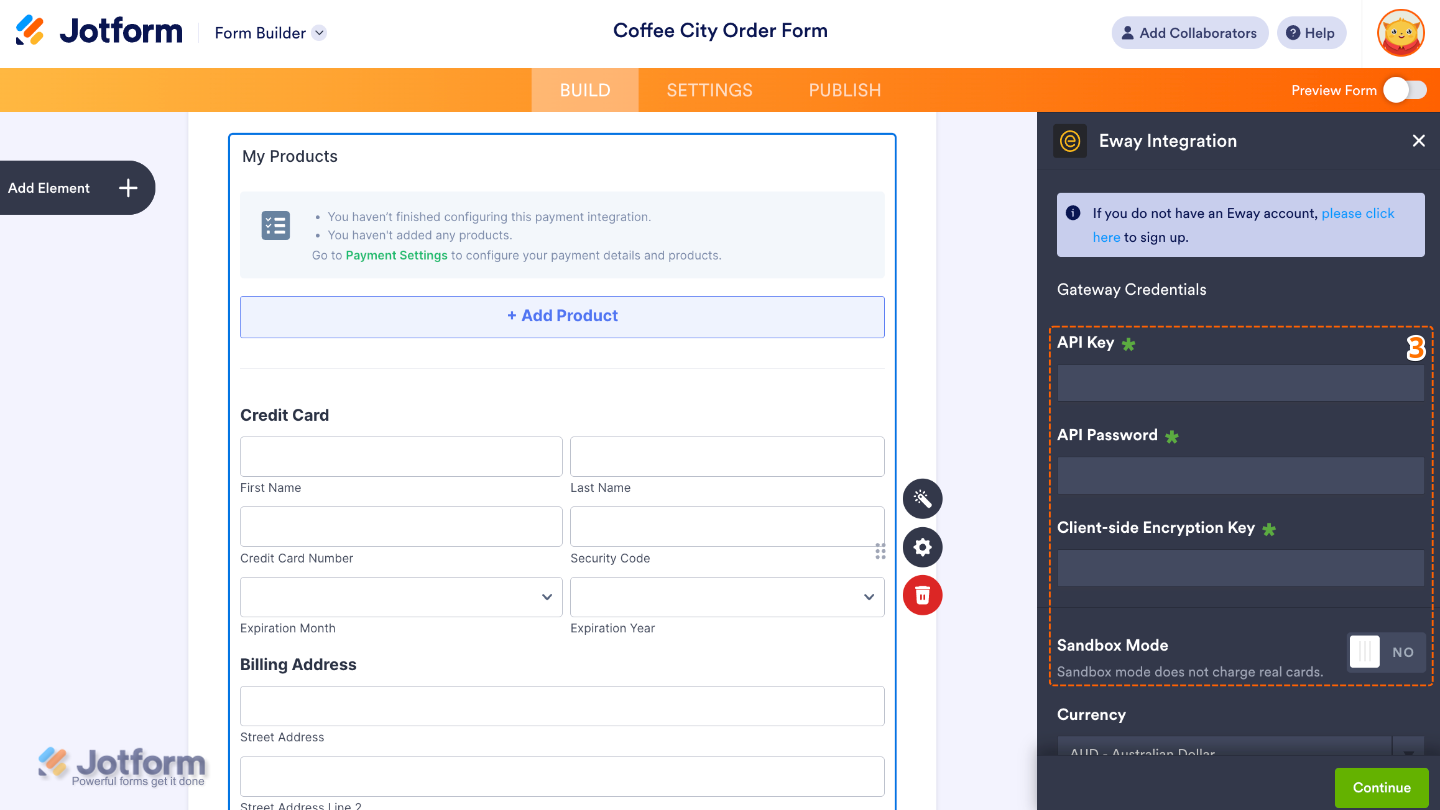 Your Eway account will require you to enable PCI compliance to use or complete the Eway integration. Only Eway’s team can do this, provided you send them Jotform’s PCI certification, so be sure to visit our PCI Compliance page to download it.