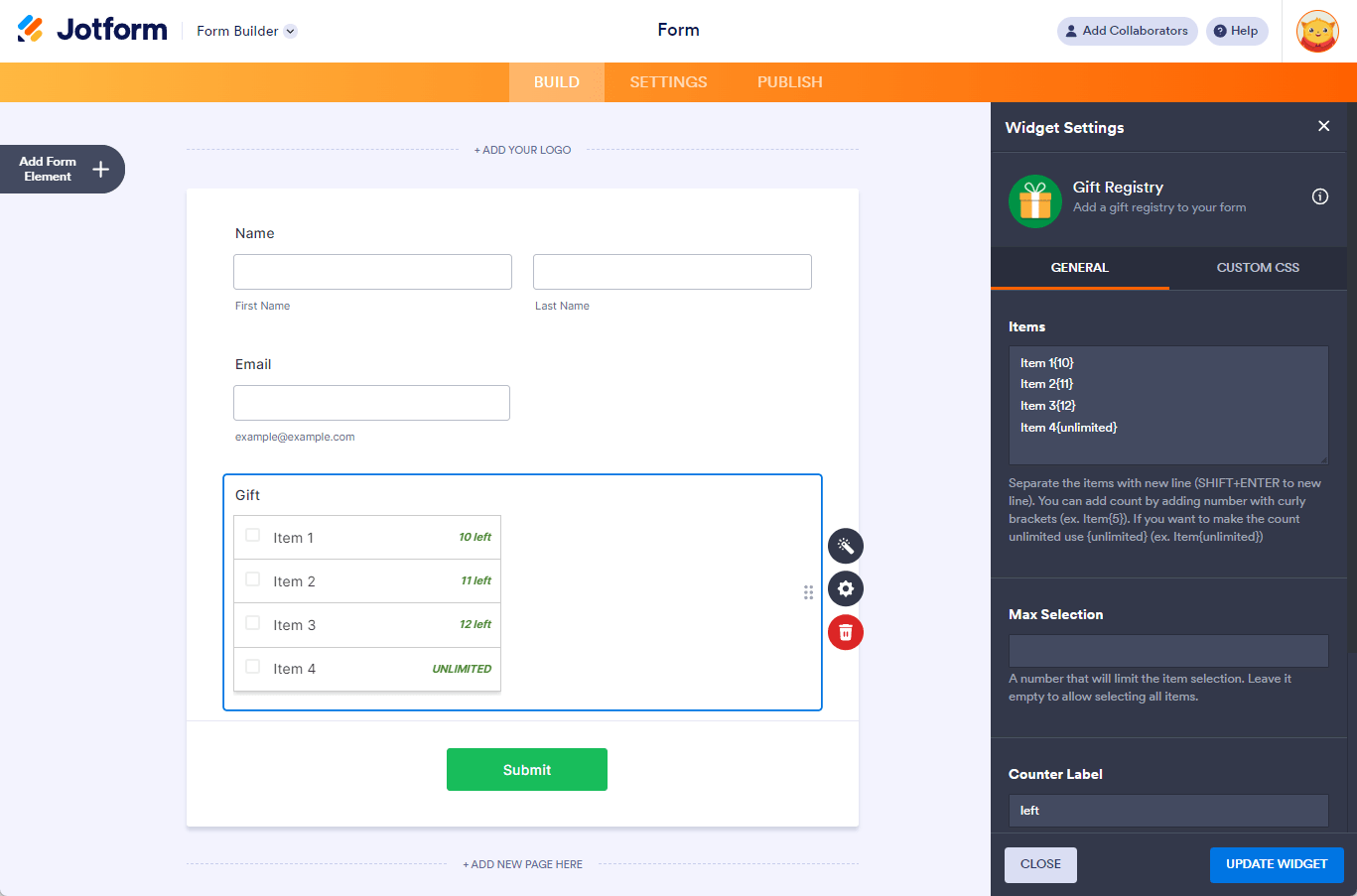 If you need more control, widgets like Inventory, Ticket Purchases, Gift Registry, and Quantity Gift Registry are a perfect fit. They let you manage availability, set limits, and automatically track quantities, making them ideal for forms that need a little extra structure and organization.