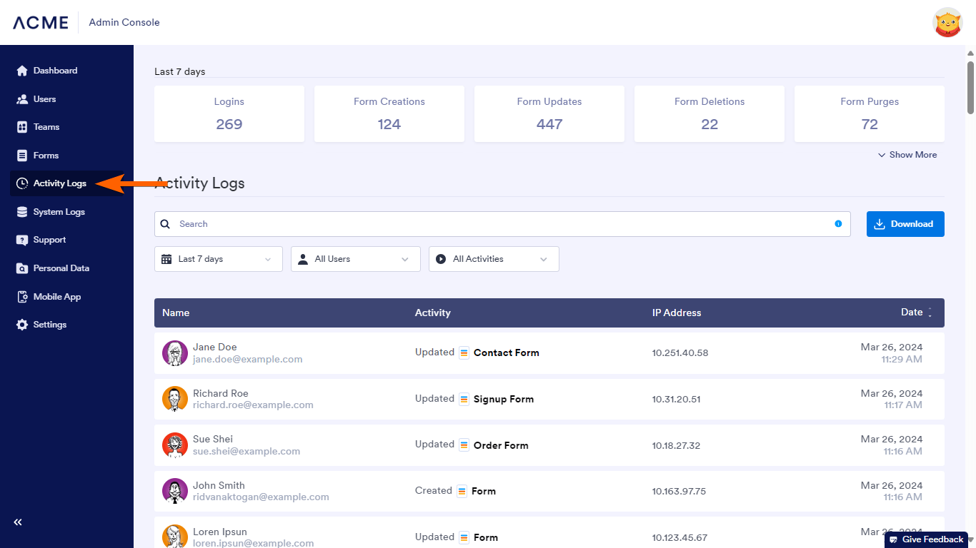 As a server admin, you can review all actions performed by users in the Activity Logs tab. You can search and filter the activity logs based on time, username, actions, and more.