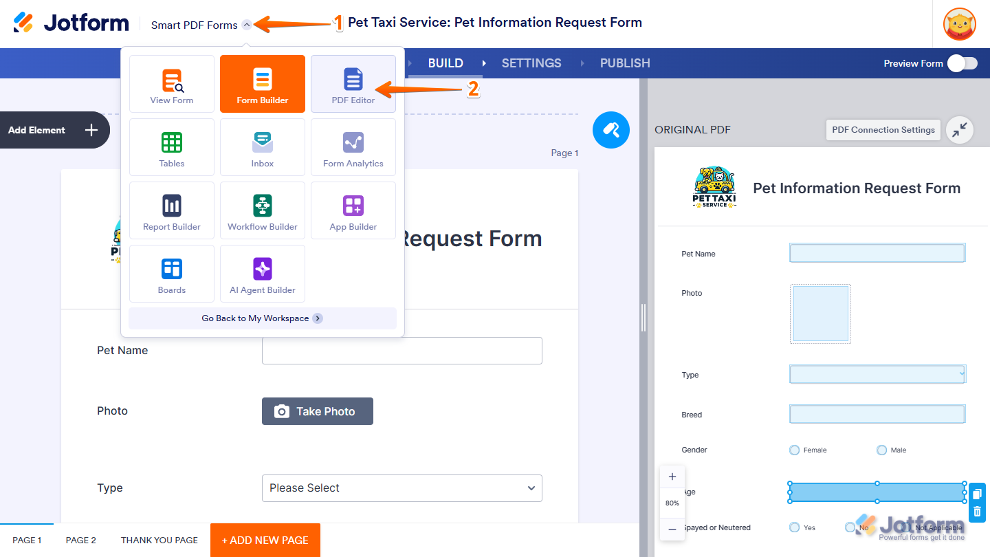 Another way to access PDF Editor to view submissions on the Original PDF Form is from the Smart PDF Forms page or any page where an asset or page linked to your Smart PDF Form is open, such as App Builder, Workflow Builder, Inbox, Tables, or Report Builder. Open the App Picker menu at the top of the page next to the Jotform logo and click on PDF Editor in the menu that opens up. That’ll redirect you to PDF Editor.