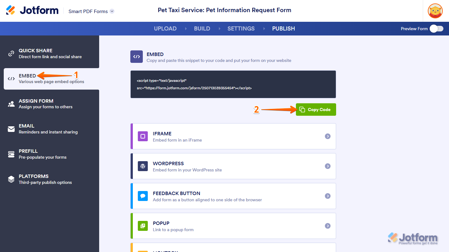 You can also have your Smart PDF Form available on your website so visitors can fill it out and submit it right there. You can copy its embed code in a few easy steps. Here’s how: