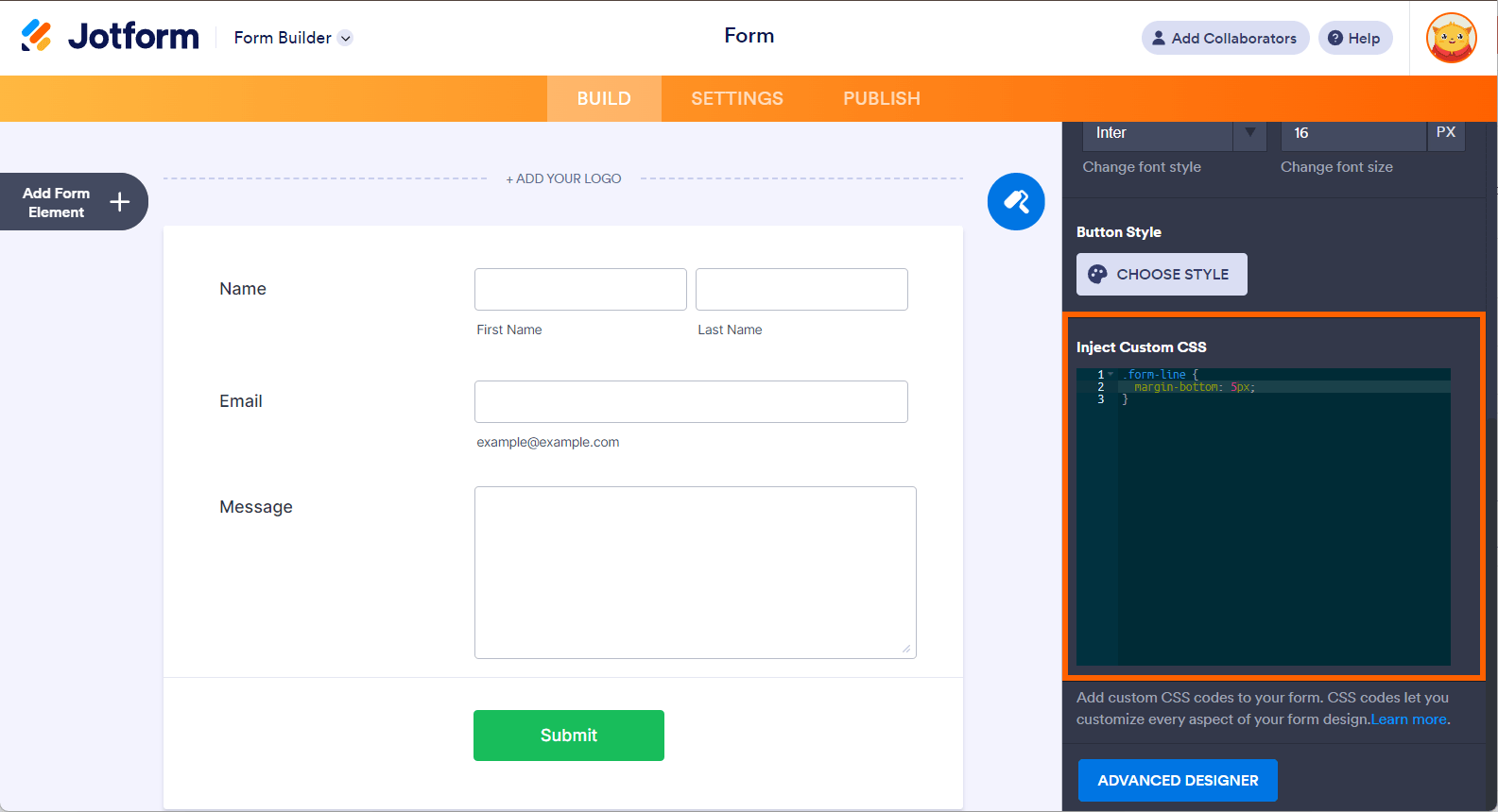 If you wish to override the value with other units, you can do it by injecting custom CSS codes. Follow the same step to get into the Styles tab of the Form Designer, navigate to the Inject Custom CSS box, and enter the following: