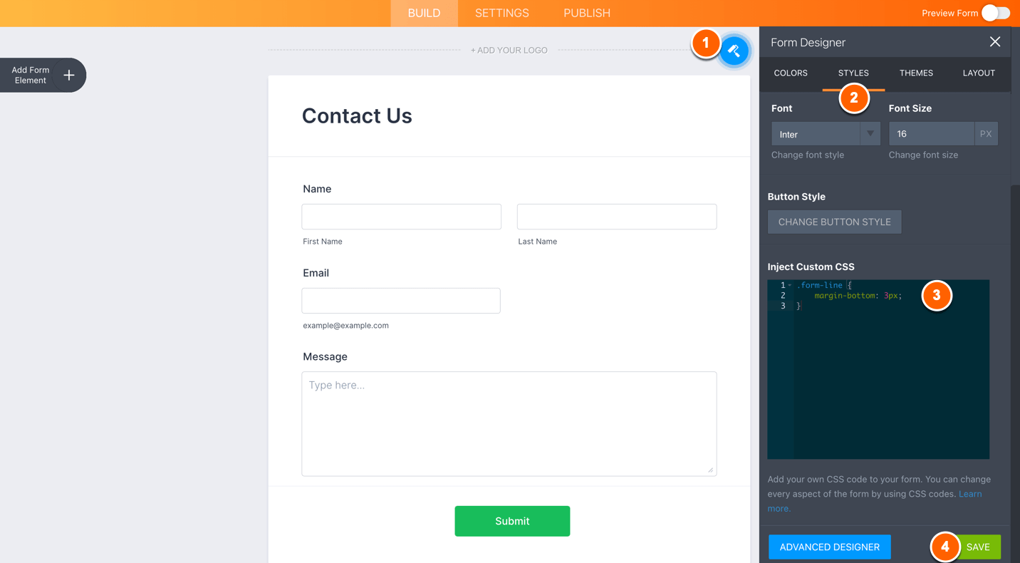 Lastly, don’t forget to click the Save button at the upper-left side of the Advanced Designer. You can return to the Form Builder by clicking the Jotform Icon at the top-right of the page. The above steps are outlined in the following short GIF: