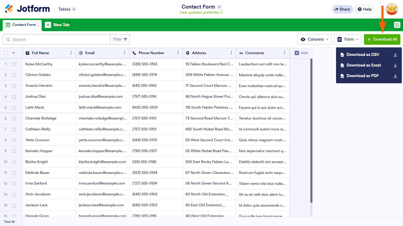 Downloading form submissions as Excel, CSV, or PDF files allows you to use your preferred tools to manage the data which can be helpful for analysis or reporting. It also serves as a data backup in case of accidental changes or deletions.