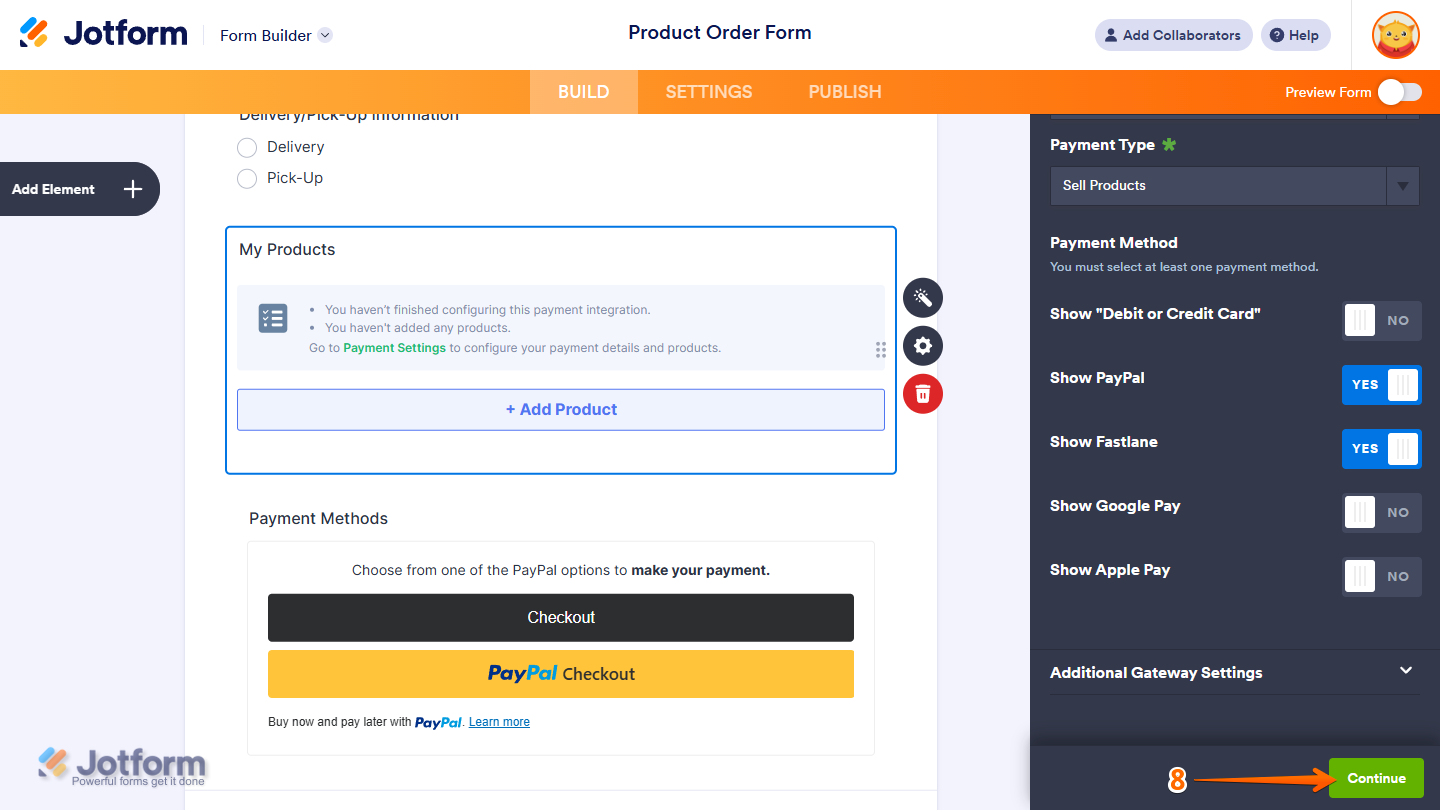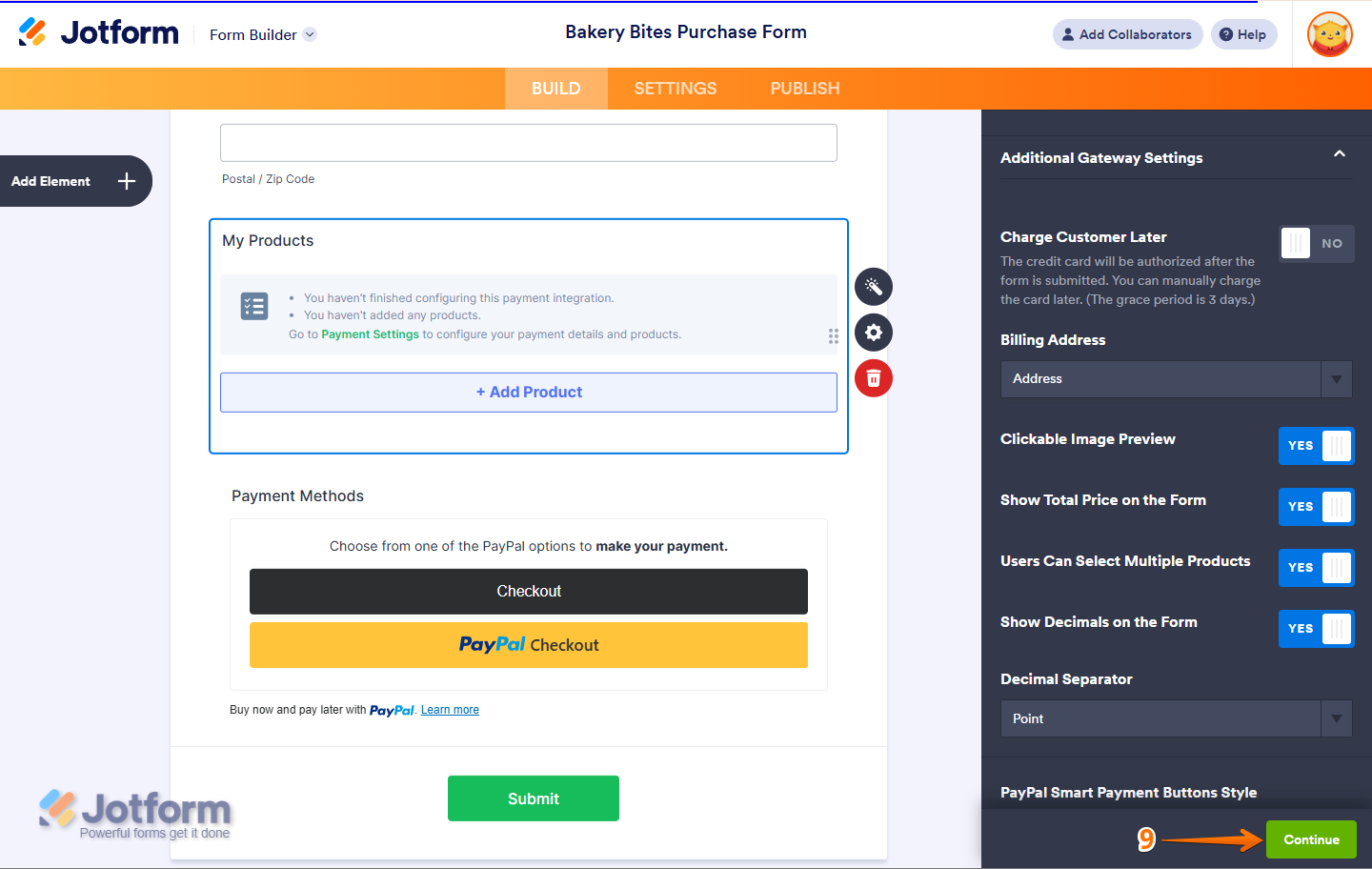 - Once everything’s set for the Sell Products and Sell Subscriptions payment types, click on Continue to create products and subscriptions for your payment field. For the User-Defined Amount and Collect Donations payment types, just click on Save at the bottom.