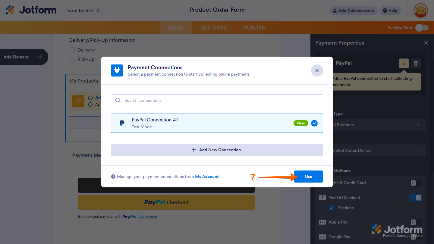 - Now, in the Payment Connections window, click on the PayPal Payment Connection you’ve just added, and then click on Use at the bottom.