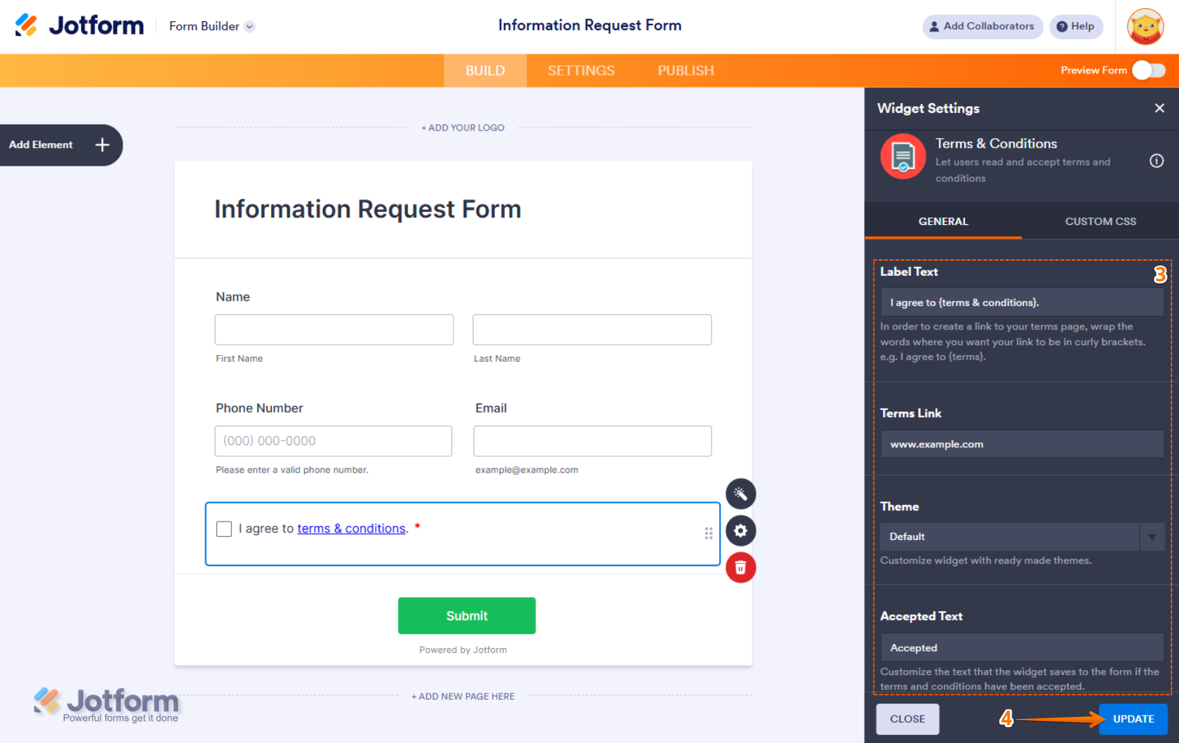 Adding the Terms & Conditions widget to your form is pretty simple. Here’s how to do it: