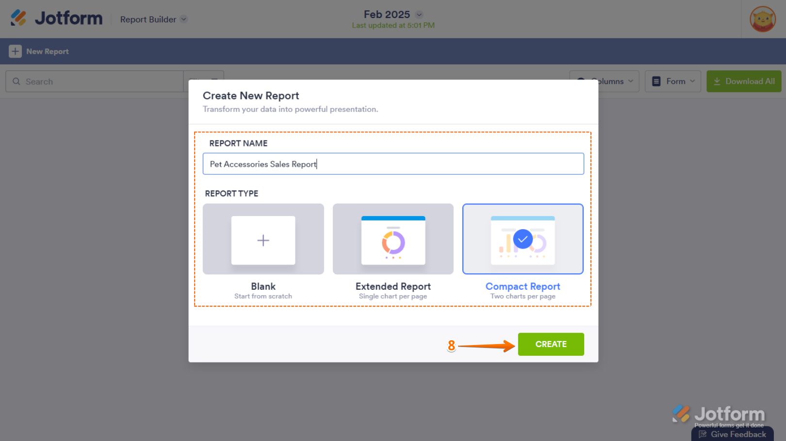 - Next, in the Create New Report window, enter a Report Name and select a Report Type, and then click on Create.