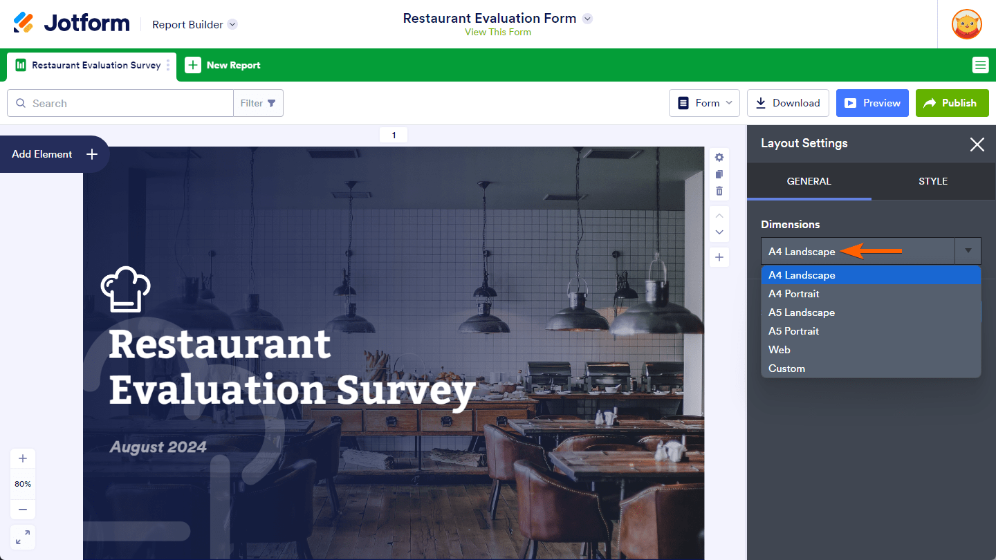 By default, your Visual Report’s dimensions are set to A4 in landscape orientation. You can customize them by selecting your preferred option from the Dimensions setting in the General tab of the Layout Settings.