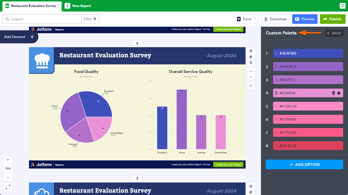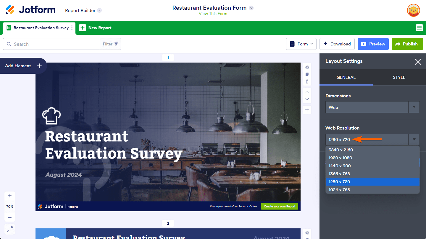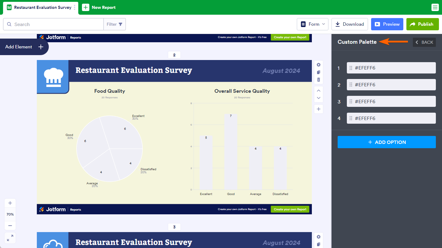 Jotform Report Builder gives you all the tools you need to customize the reports of your submission data. You can set a custom dimension for your report and change the background color on each page. You can also customize your report by adding texts, headers, images, shapes, and icons. You can resize, position, and style each element you add to your preference. The Jotform Report Builder page has customization settings for its layout, page, and elements.
