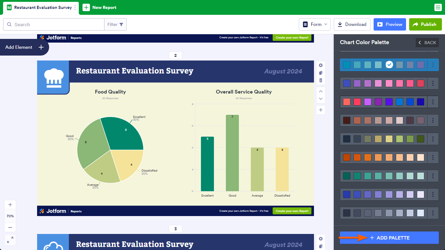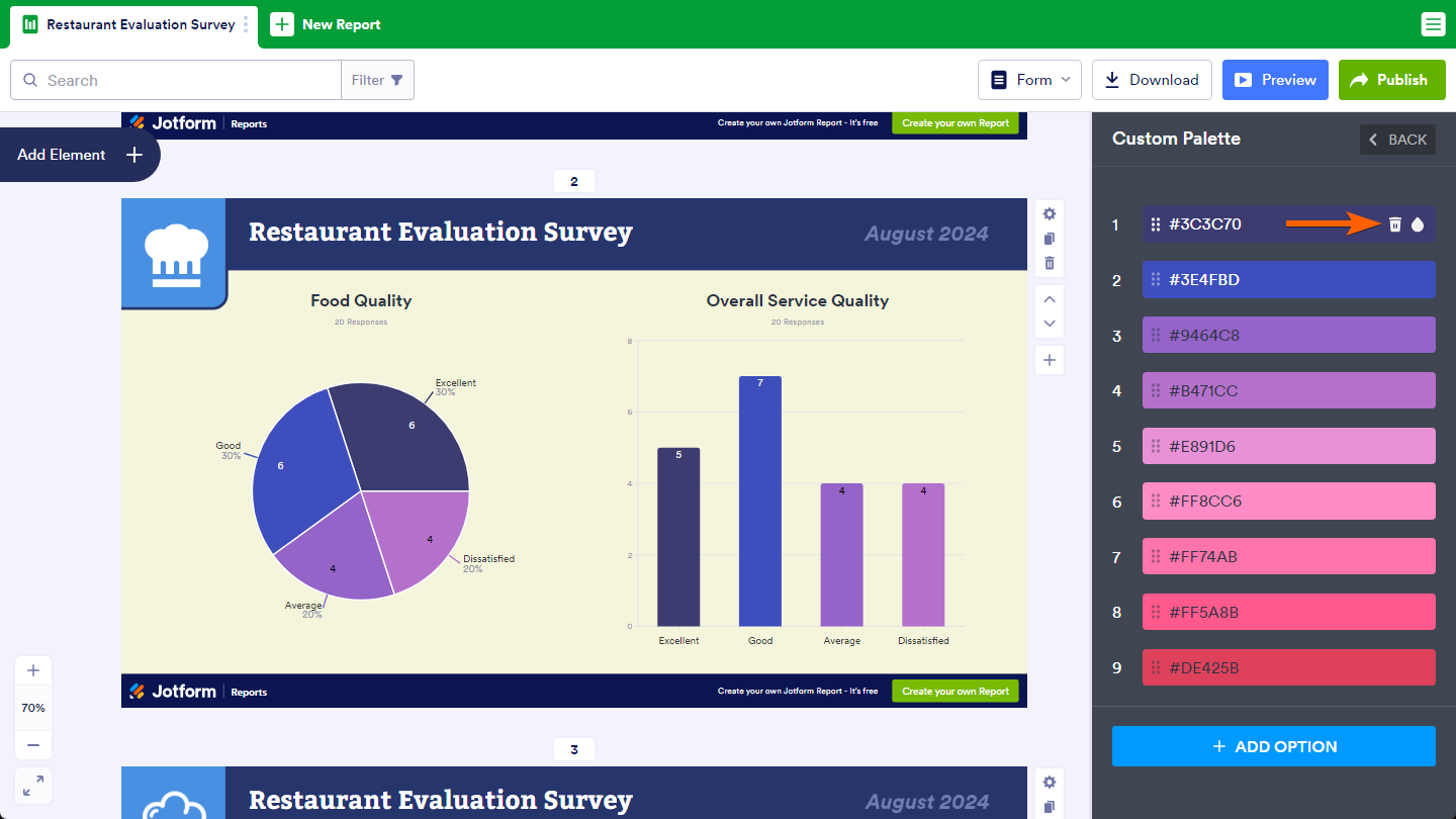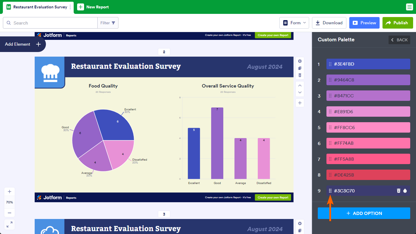 Jotform Report Builder gives you all the tools you need to customize the reports of your submission data. You can set a custom dimension for your report and change the background color on each page. You can also customize your report by adding texts, headers, images, shapes, and icons. You can resize, position, and style each element you add to your preference. The Jotform Report Builder page has customization settings for its layout, page, and elements.
