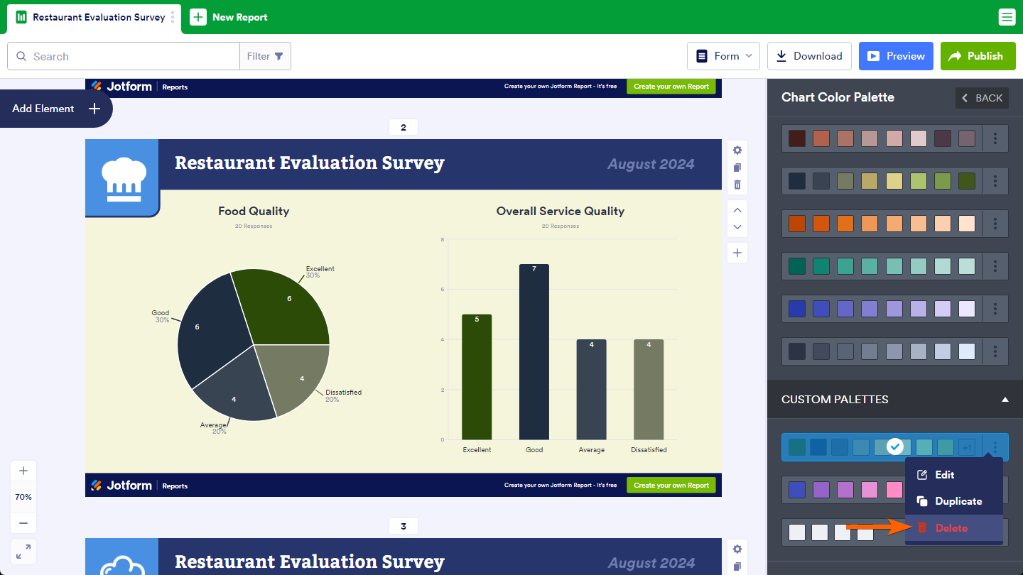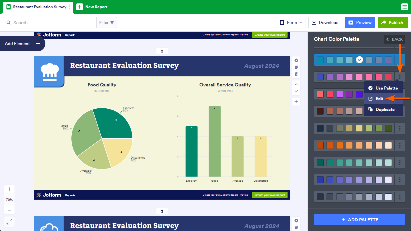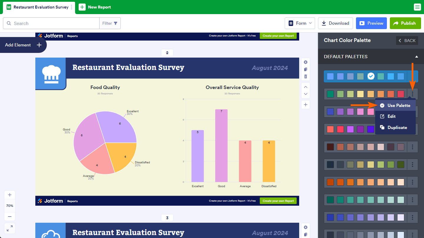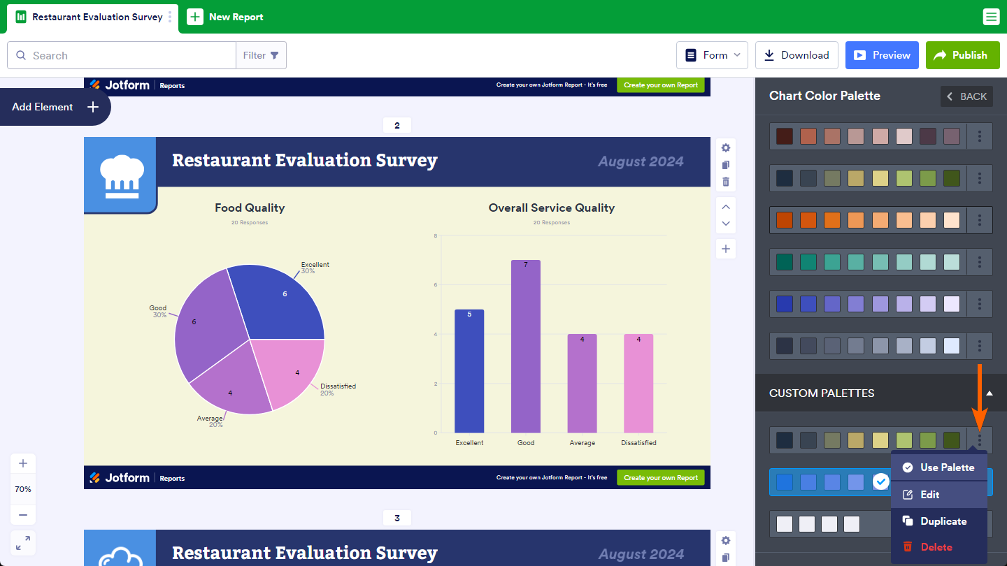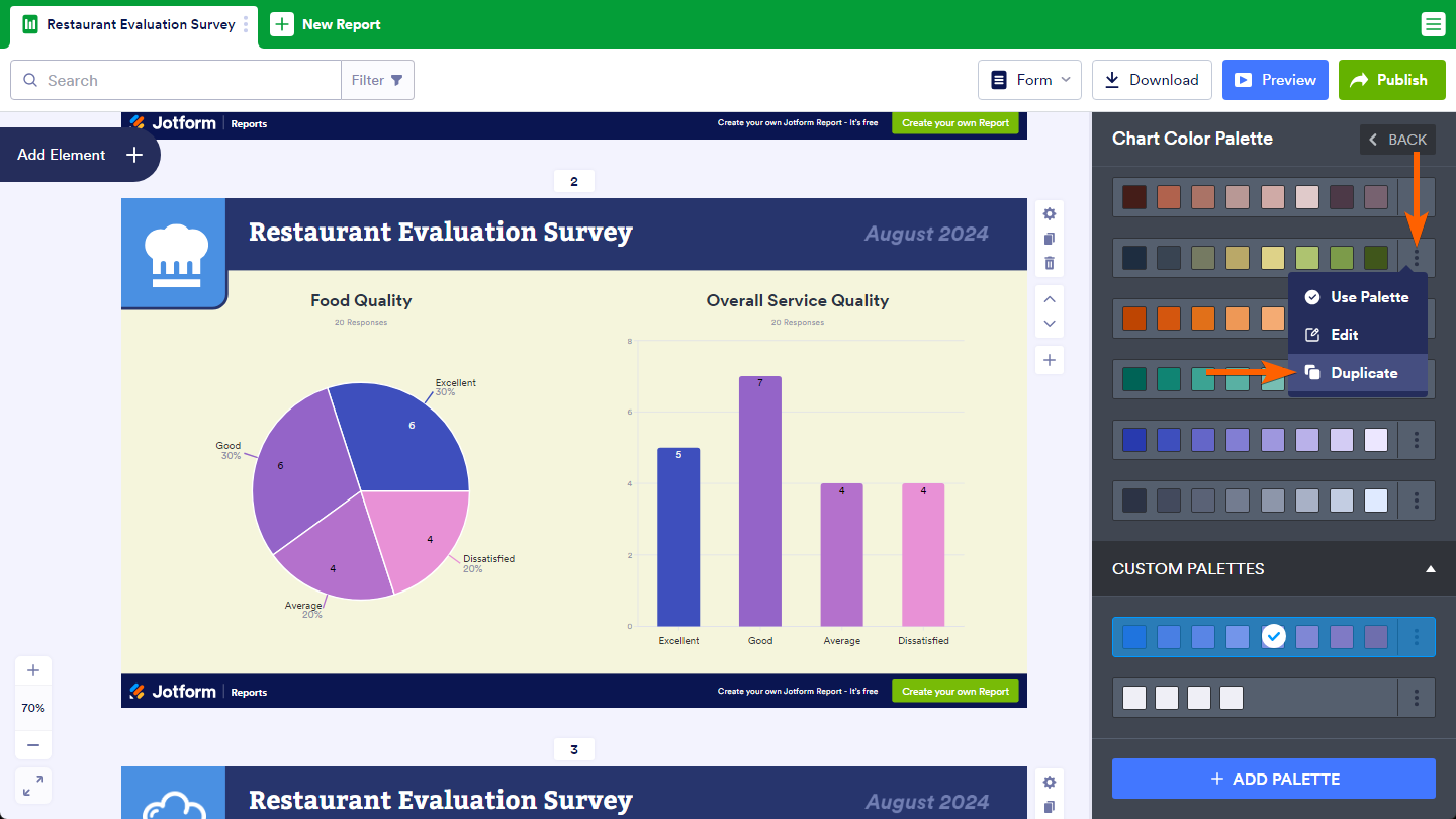 You can choose the Duplicate option from the palette’s menu if you want to create a custom copy of any palette without immediately applying its colors to your charts. You can find the duplicated palettes under the Custom Palettes section, which you can modify and use later.