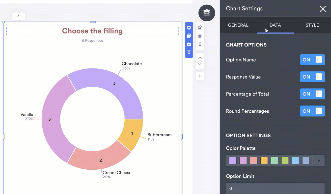 Similar to the Chart Color Palette Setting under the Style tab of the Layout Settings, this option also allows you to change the colors of the chart options as a group. However, unlike the one in the Layout Settings, this setting only changes the colors of the options in a single chart. The selected Color Palette in this setting will override the selected Chart Color Palette in the Layout Settings.