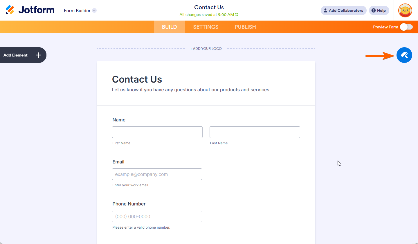 - In the Form Builder, click the Form Designer (paint roller icon) on the right side of the page.