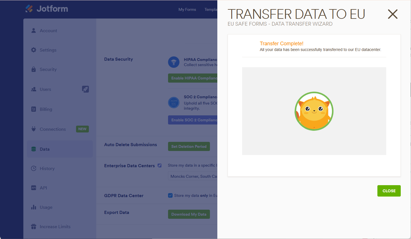 Jotform is serious about GDPR compliance. If you are from the European Union (EU) or doing business within this region, you must store your forms and data in a EU data center. Europe Datacenter feature is automatically enabled for accounts created within the European Union. However, if you think you are not yet compliant or want to become compliant, this guide will walk you through it.