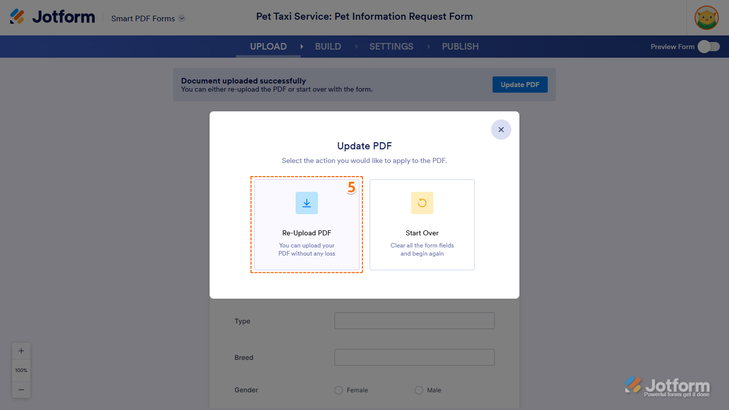 - Then, in the Upload PDF window that comes up, click on Re-Upload PDF to start uploading your new PDF Form.