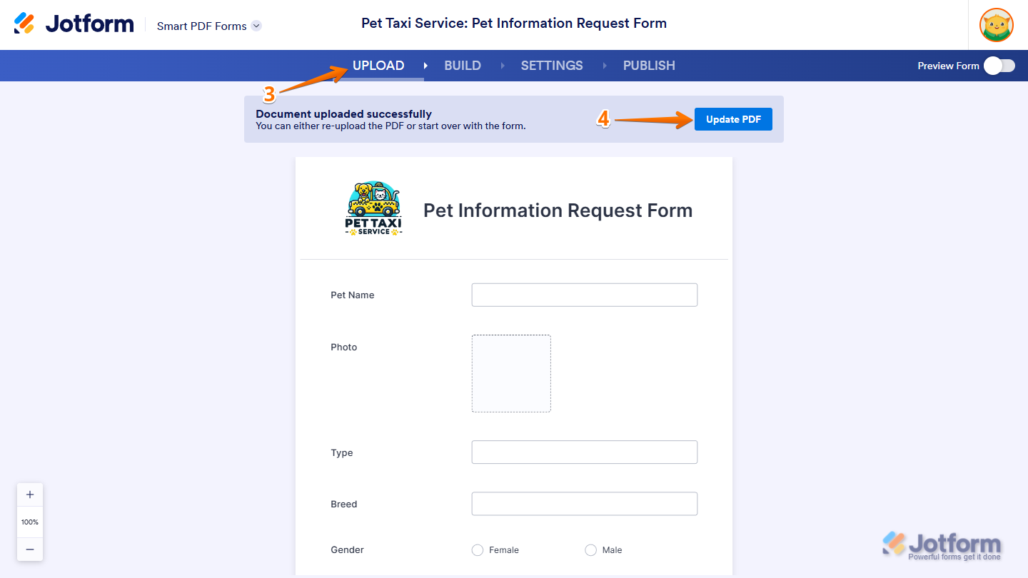 Jotform Smart PDF Forms let you convert your existing PDF forms into online forms, keeping your layout while making it easier for people to fill out and submit information. If you ever need to make changes to the original PDF—like fixing a typo, updating your branding, adding new sections, or replacing it with a more recent version—you can do that without starting your connected online form over.