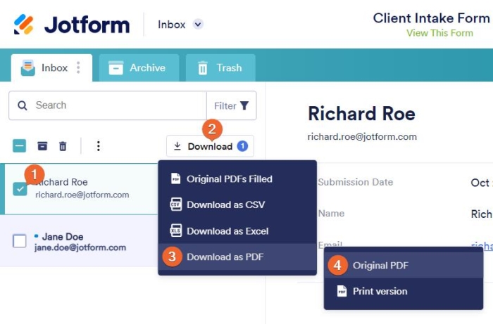 Depending on the number of entries, the system will either start the download immediately or send the download link to your registered email when downloading the original PDF in Jotform Inbox.