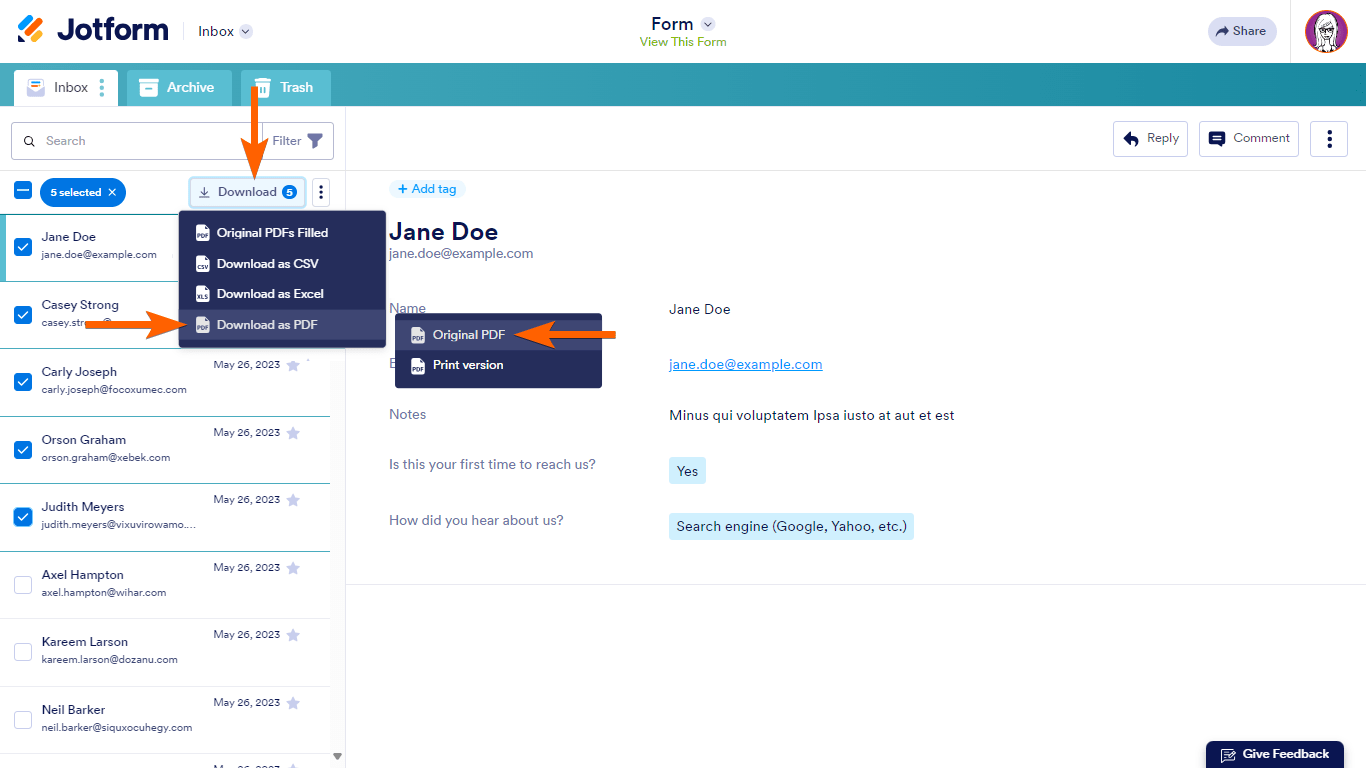 - In Jotform Inbox, choose the entries to download.