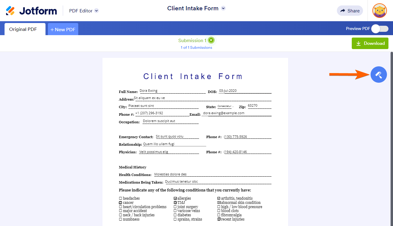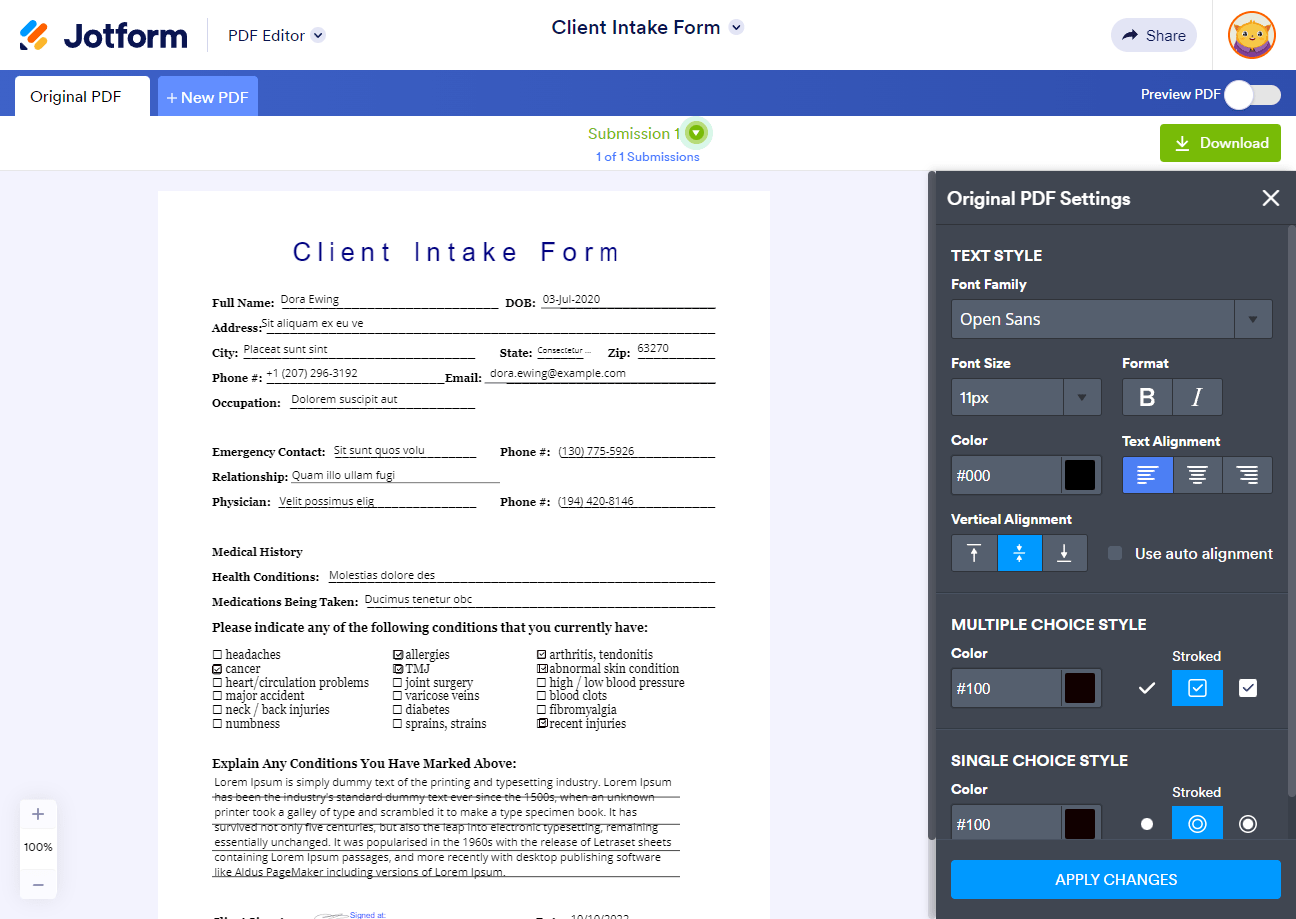 Jotform’s Smart PDF Forms allows you to customize the alignment, size, font type, and colors of the text fields in the Original PDF document. You can also change the styling of the Multiple and Single Choices fields.