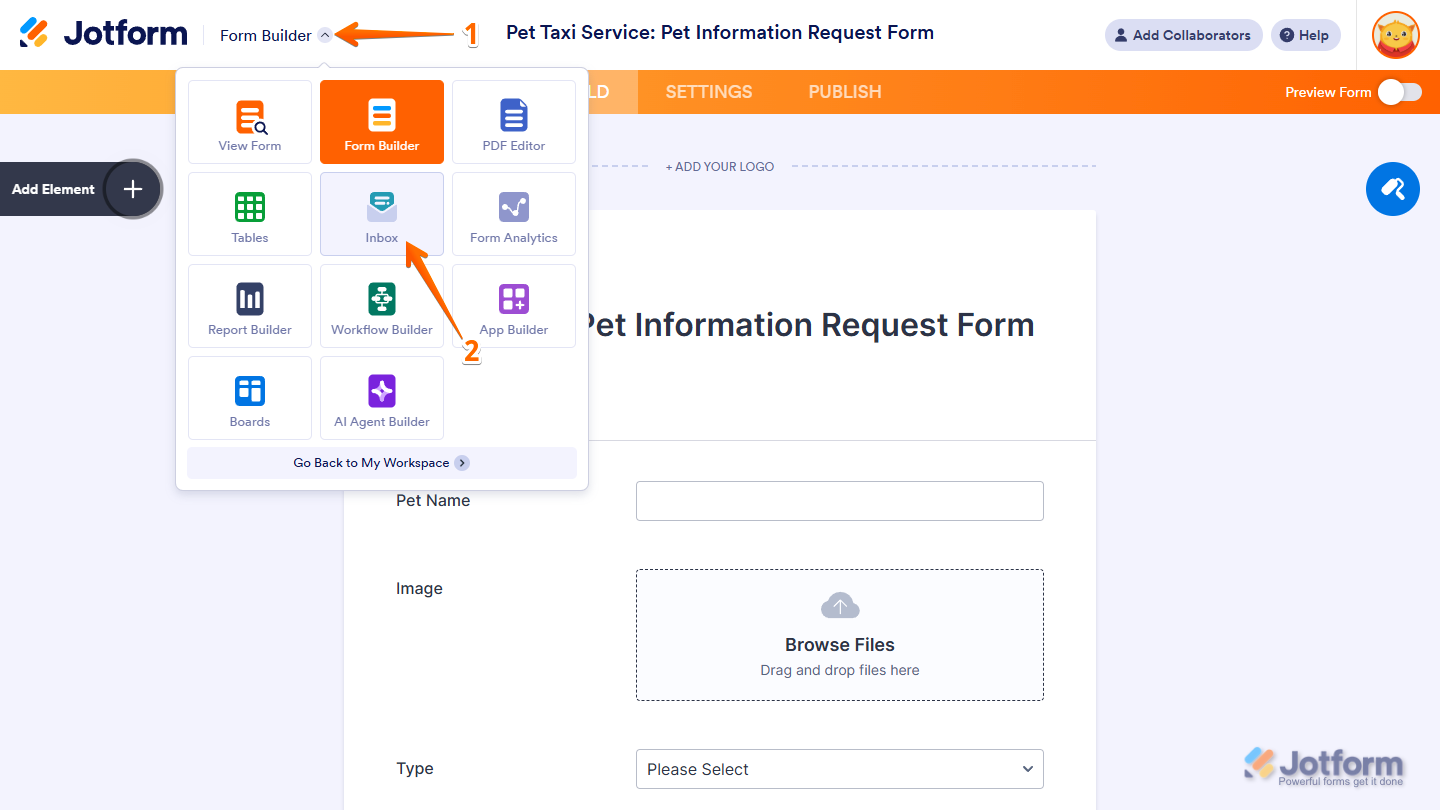 - Click on the App Picker menu at the top of the page next to the Jotform logo.