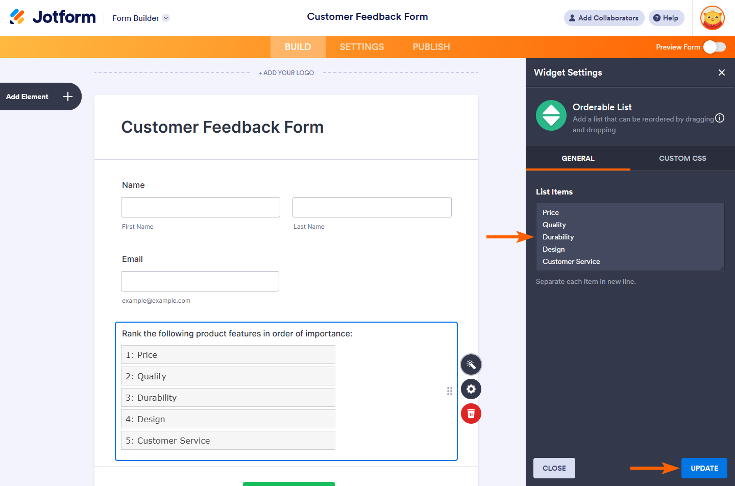 In Jotform, you can easily include a ranking question using the Orderable List widget, which lets users drag and drop options from a predefined list to create their rankings. A ranking question adds depth to your survey forms by asking respondents to rank options according to their preferences, priorities, or importance. This feature helps you gather more detailed insights than simple yes/no questions.