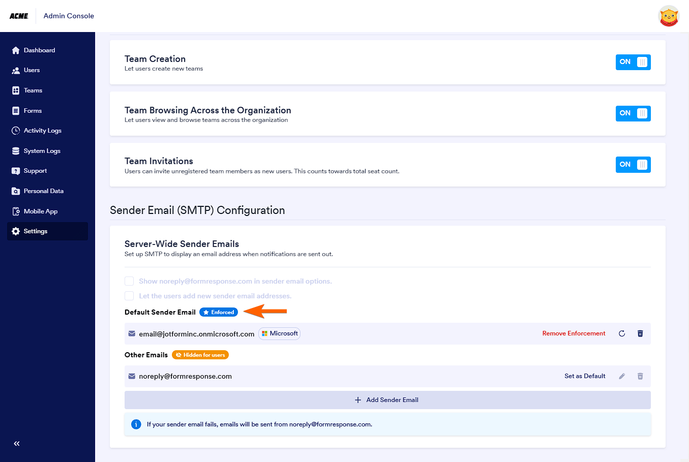 When you check the Enforce New Default Sender Email Organization-Wide box, all forms on your Enterprise Server will automatically use the new Microsoft SMTP sender email. If you leave it unchecked, users can choose it on their own.