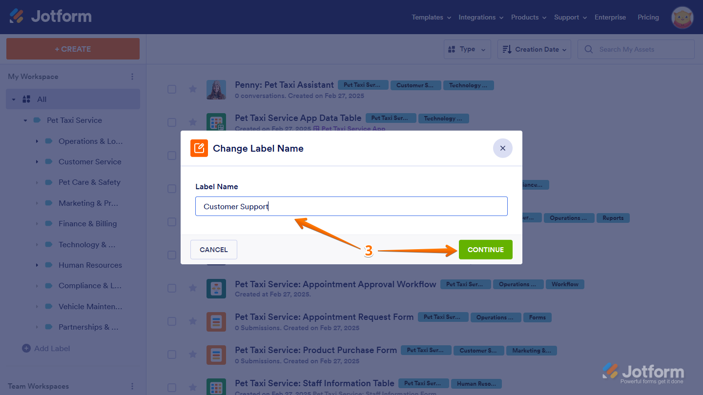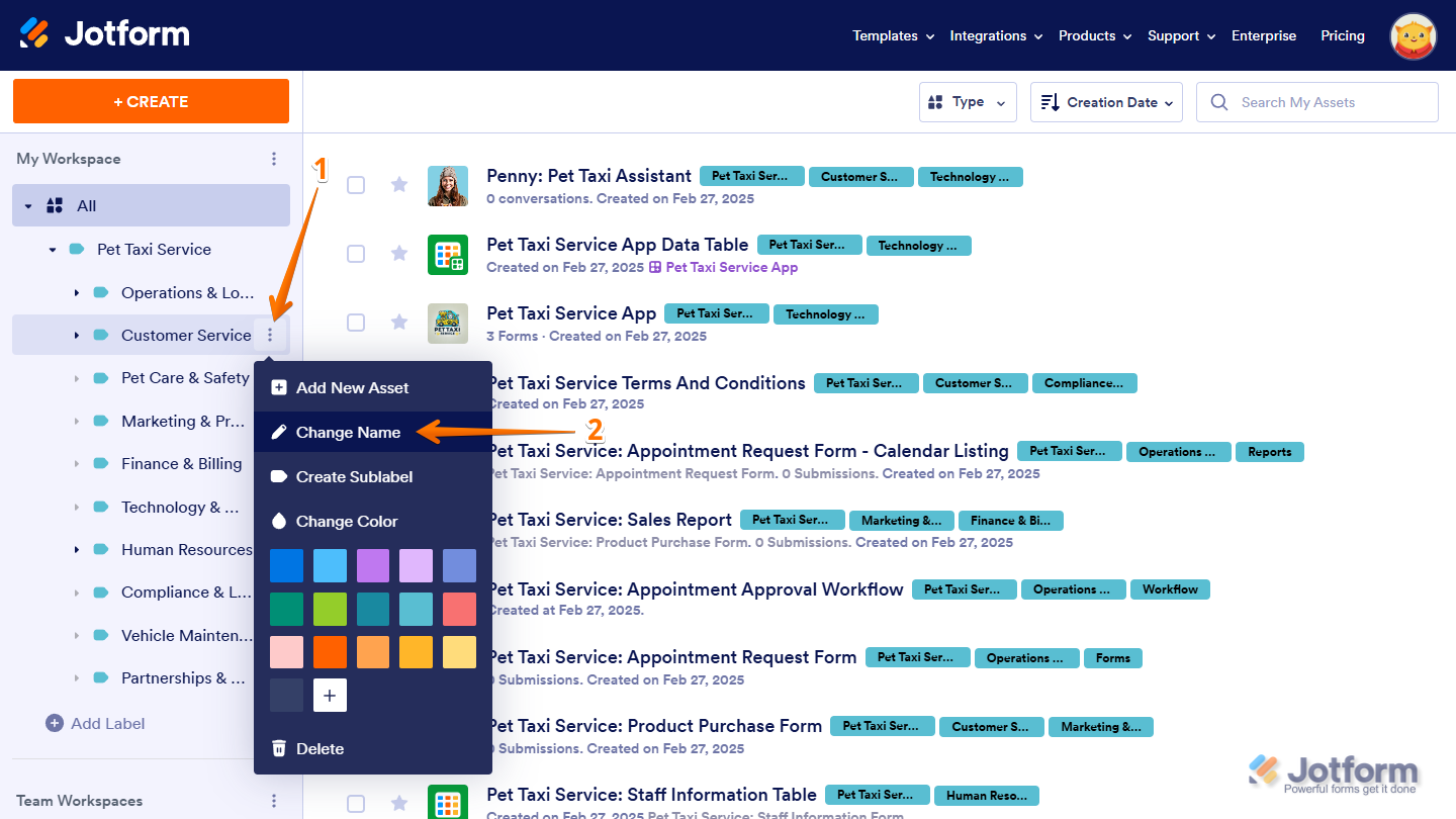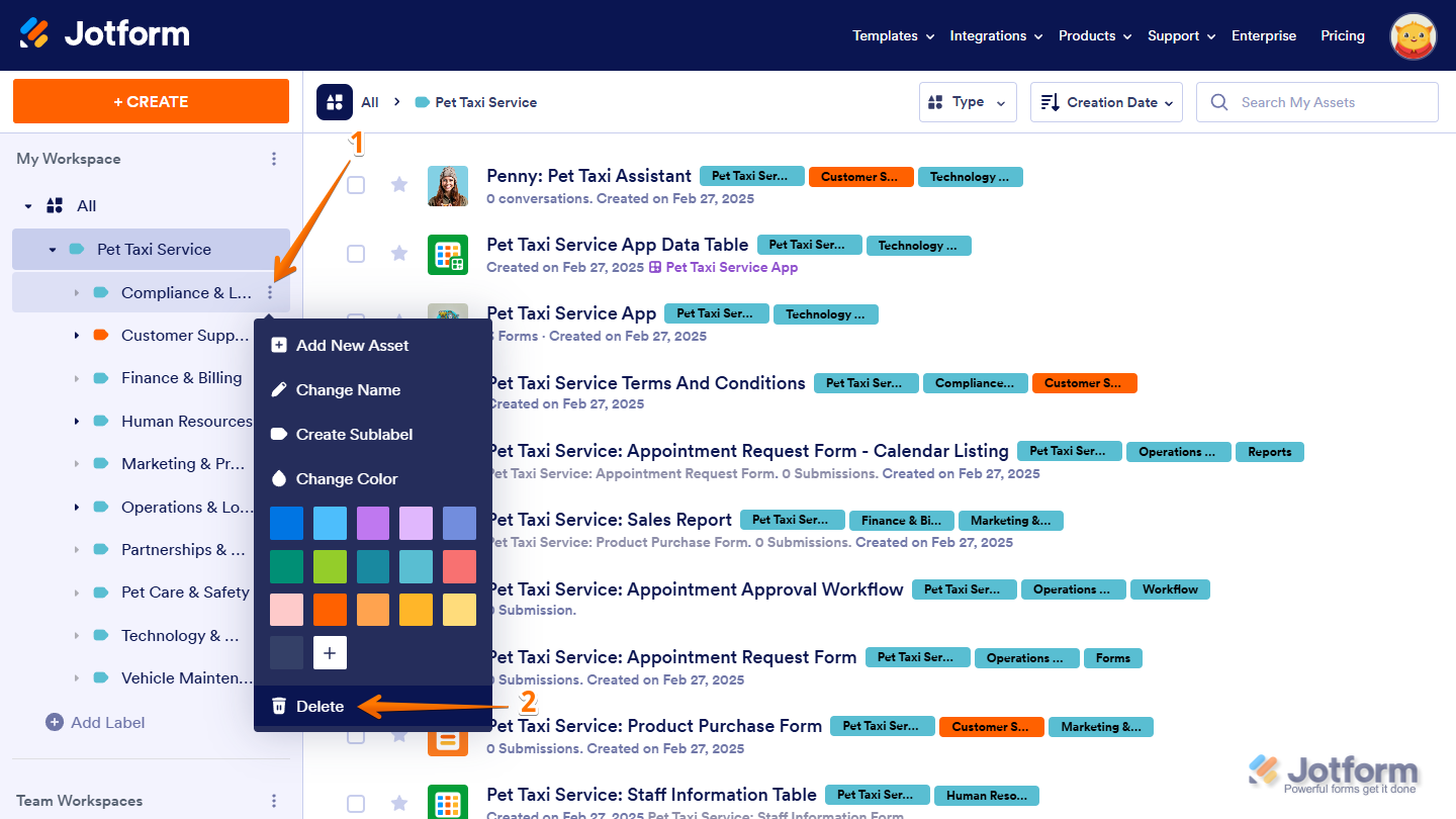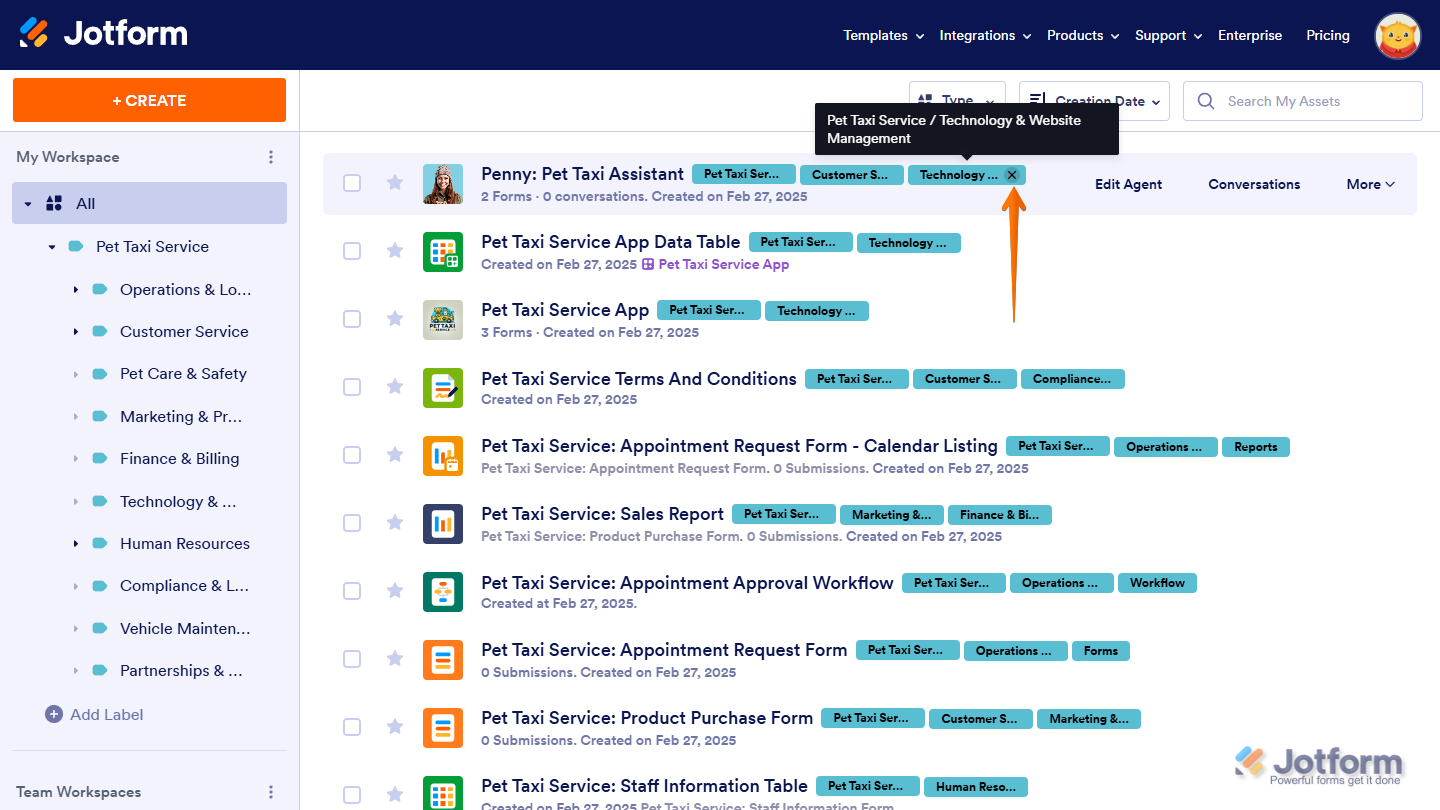 Labels help you organize workspace assets by categorizing them, making it easier to find and manage what you need. Instead of scrolling through a long list, you can filter and access Forms, AI Agents, Workflows, Apps, Sign Documents, Tables, and Reports based on their assigned labels. As your workspace grows, labels keep everything structured, helping you sort assets into meaningful groups. You can create sublabels for more detailed organization, customize labels to fit your workflow, and sort them alphabetically for easier navigation. Since labeled assets remain flexible, you can update or reassign them anytime to keep your workspace organized.