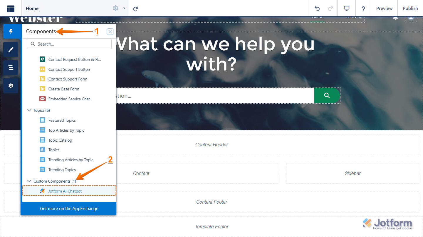 - Make sure to install the latest version of Jotform from Salesforce AppExchange. This adds the Jotform AI Chatbot to your Custom Components section so you can easily access it when setting up your site.