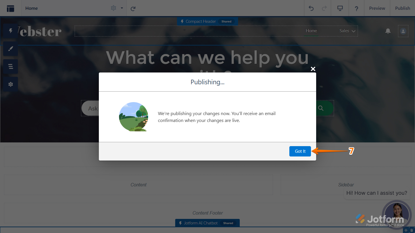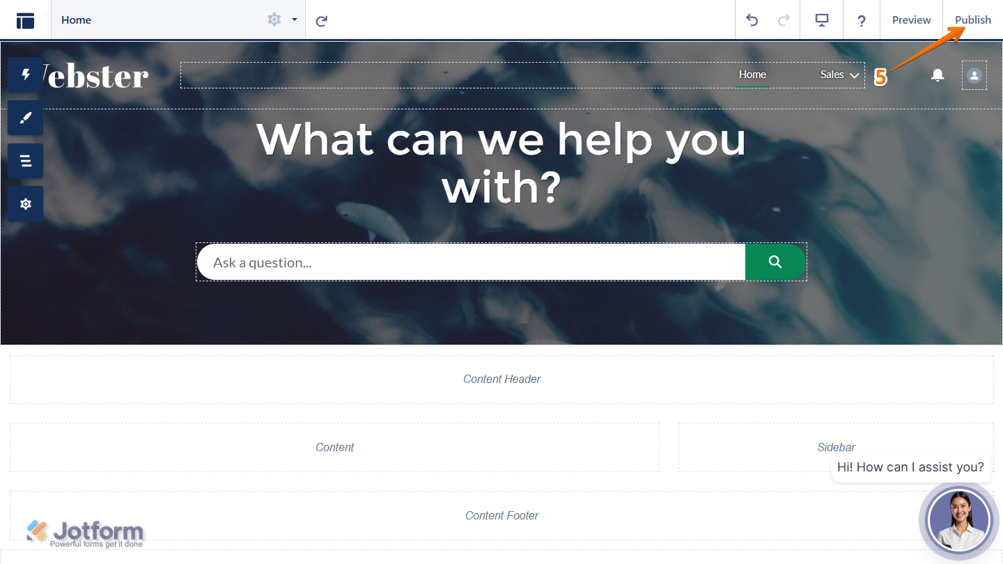 For better visibility, add the Jotform AI Chatbot component to your site’s Header or Footer. This way, it stays accessible across all pages instead of just one.