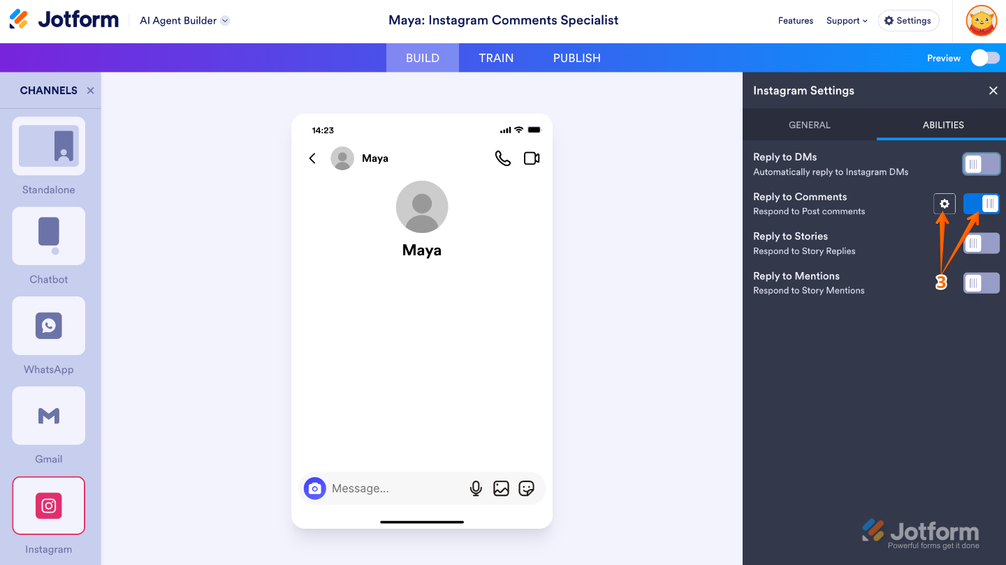 - Now, in the Instagram Agent section on the right, under Agent Abilities, toggle on Reply to Comments, and then click on the Gear icon next to it.