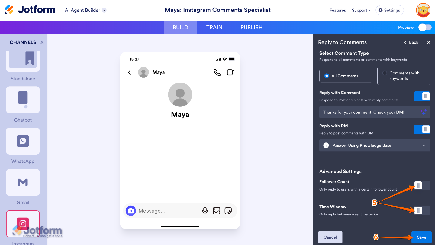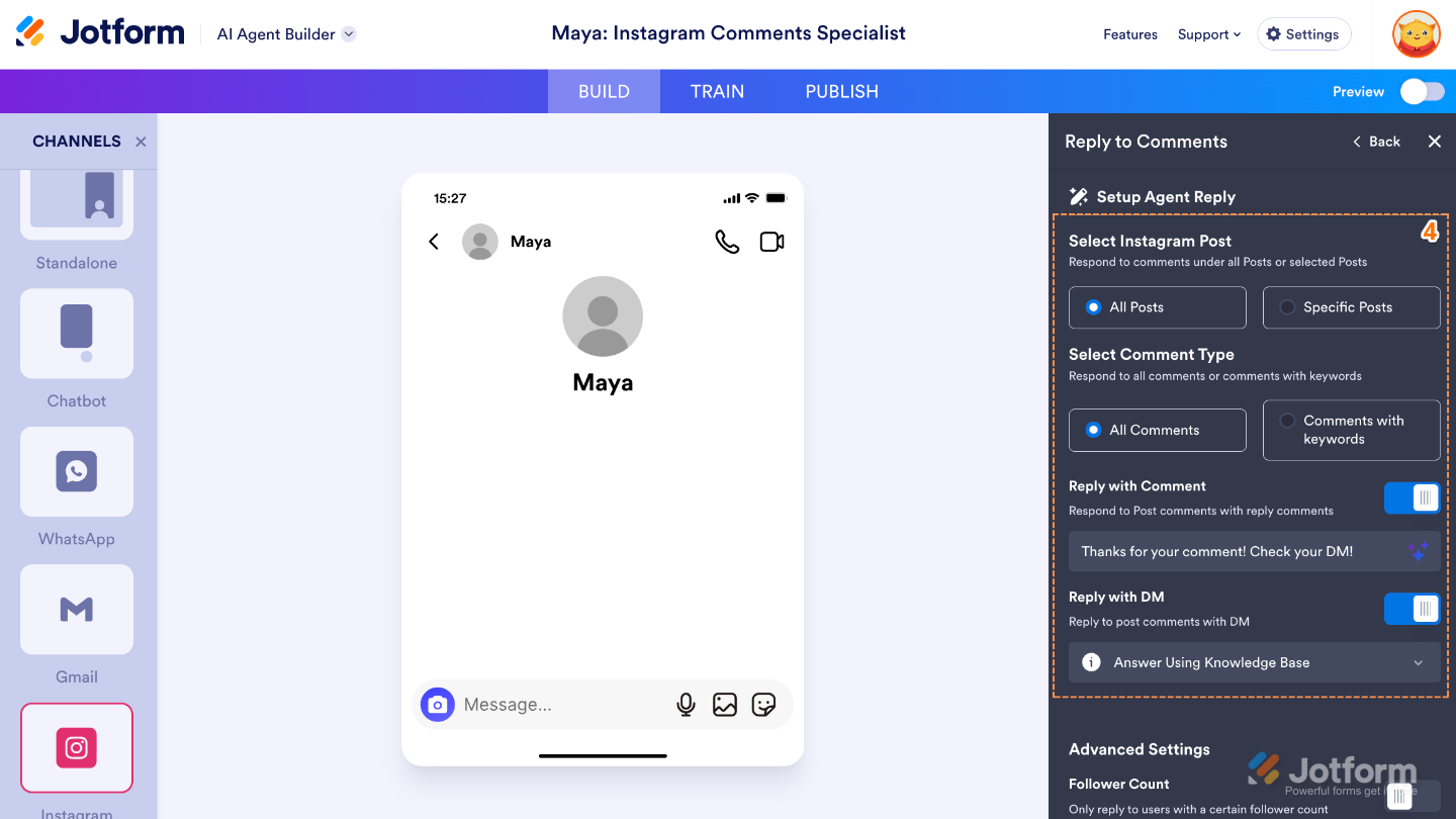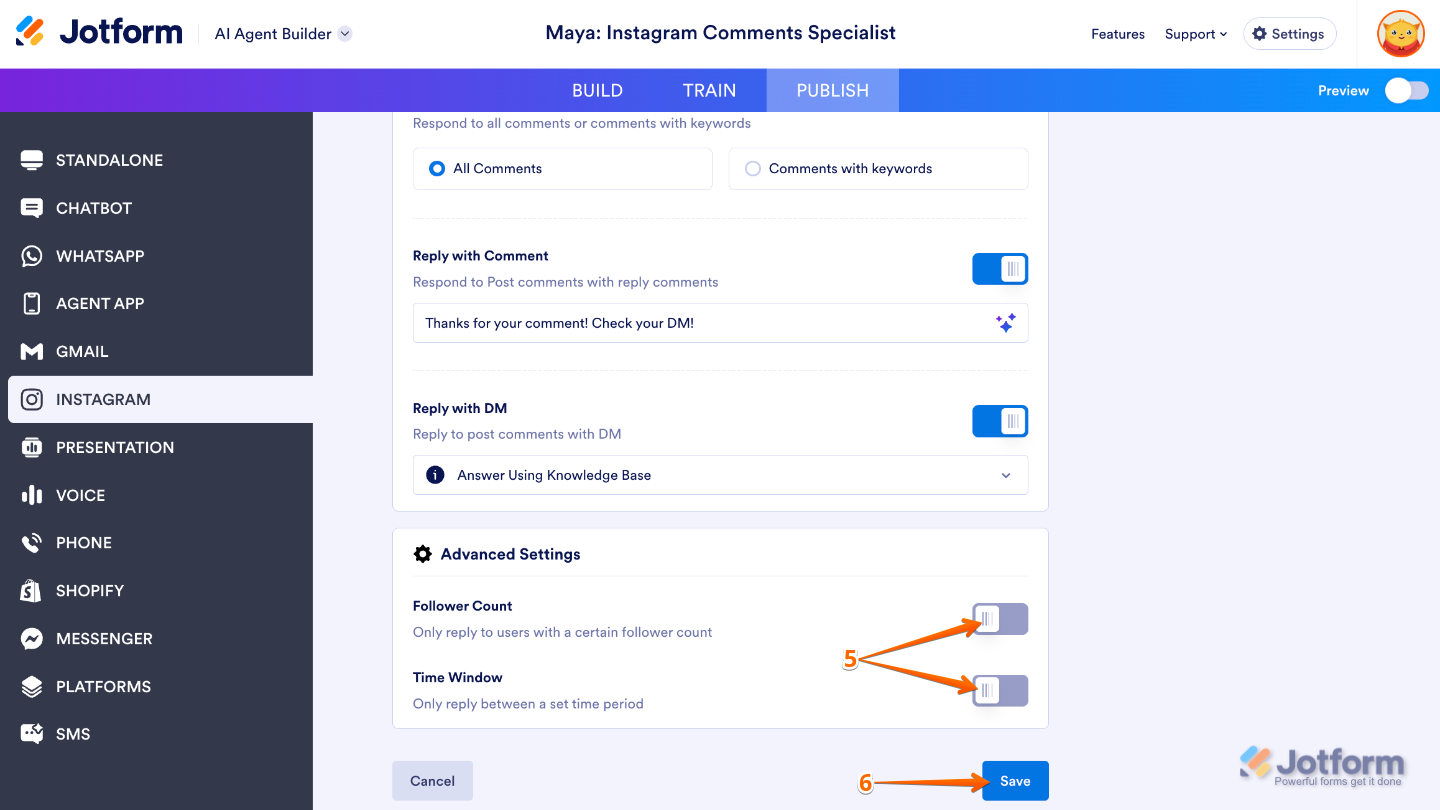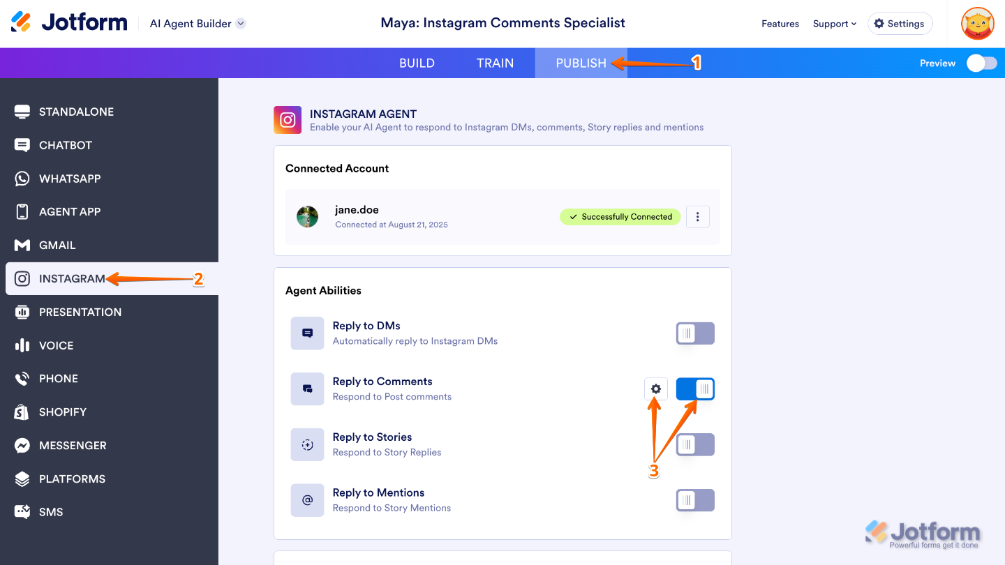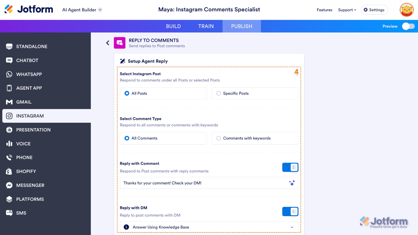 Setting up your auto-replies in Jotform’s Form Builder is quick and easy. In just a few clicks, your Instagram Agent will be ready to respond to comments automatically—keeping your audience engaged while you stay focused on the bigger picture.