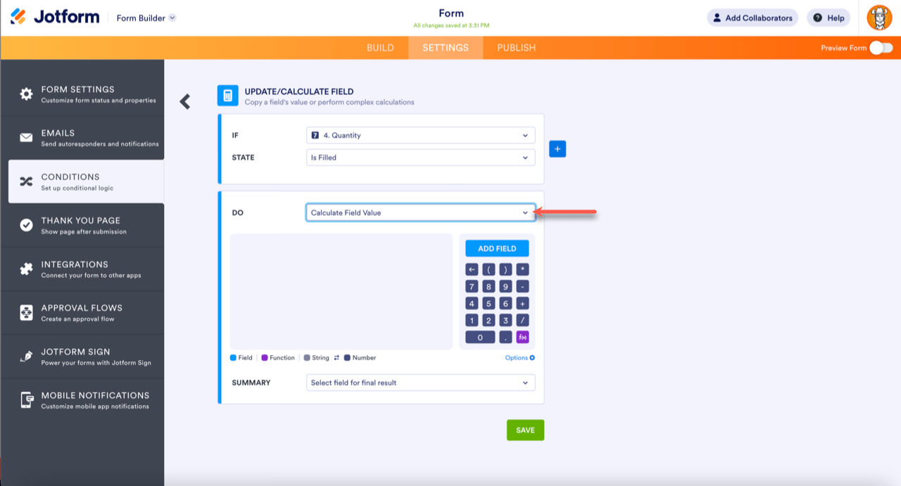 Another way to calculate a total is by using Conditional Logic. This approach lets you set rules that run calculations based on user input. For example, you can calculate a total only when a specific field is filled out. Here’s how to set it up: