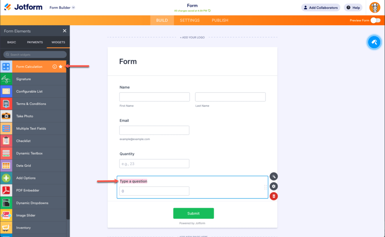 - Then, in the Form elements menu, under the Widgets tab, click on Form Calculation. Or, just drag and then drop it to where you want it to be on your form.