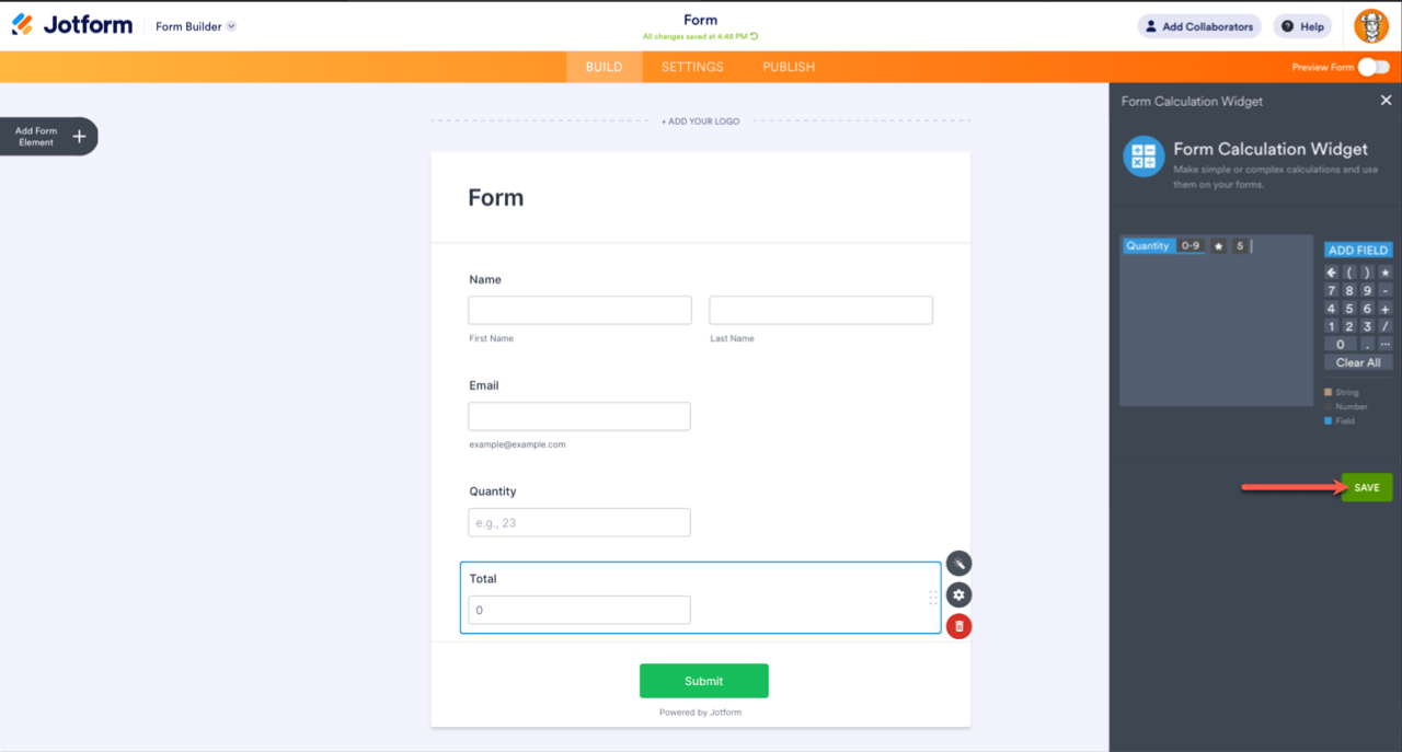 The Form Calculation widget lets you calculate totals on your form using basic or advanced math. You can add fields together, multiply values, or use built-in functions like round() or min()—no coding required. Follow these quick steps to get started: