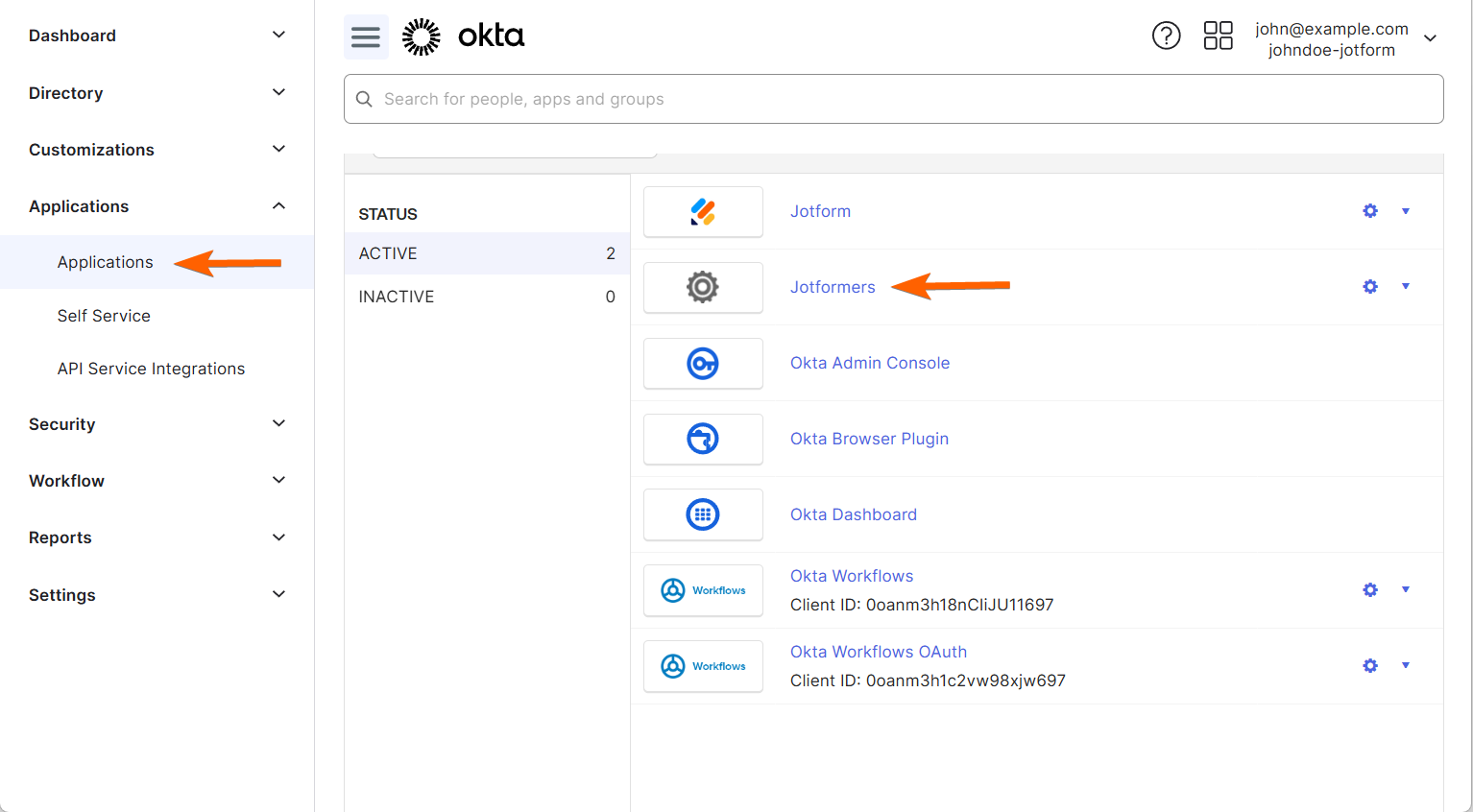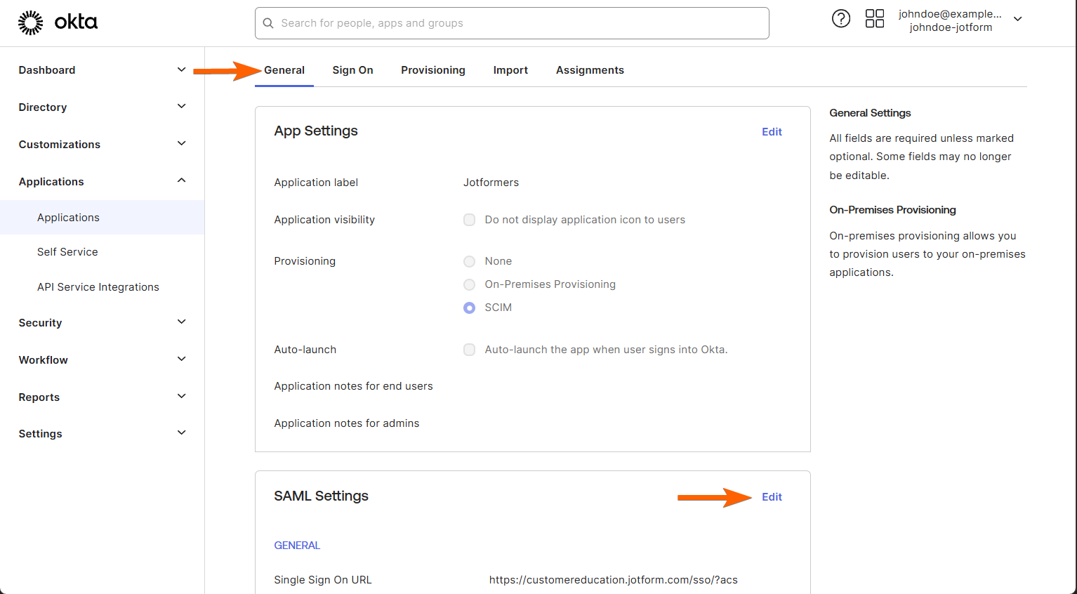 - In the Applications section on the right, click on the Custom SAML 2.0 App you created for Jotform SSO.