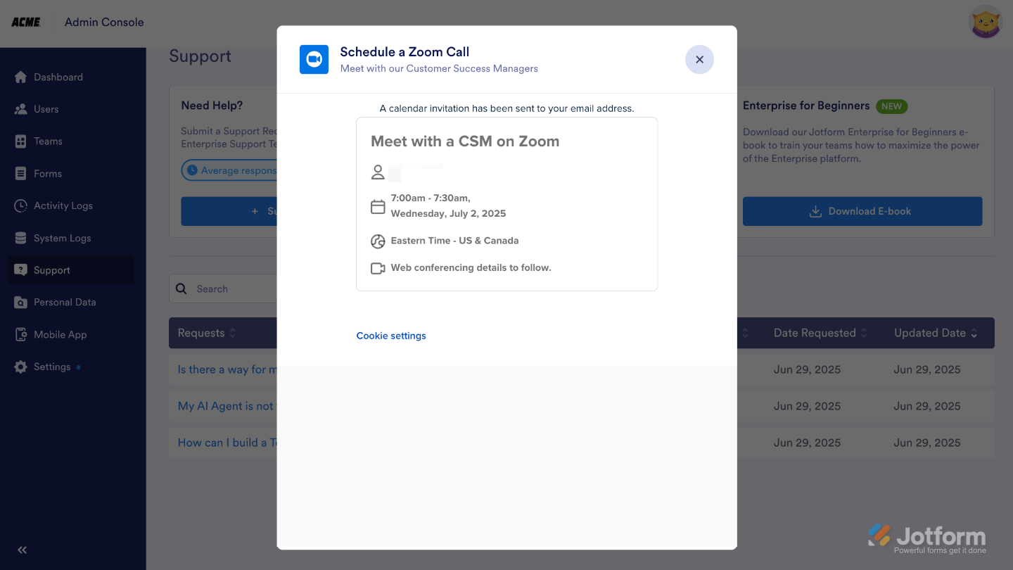 At Jotform Enterprise, your success is our top priority. It only takes a minute to schedule a call with a Customer Success Manager, and it’s the fastest way to get personalized support exactly when you need it. Here’s how: