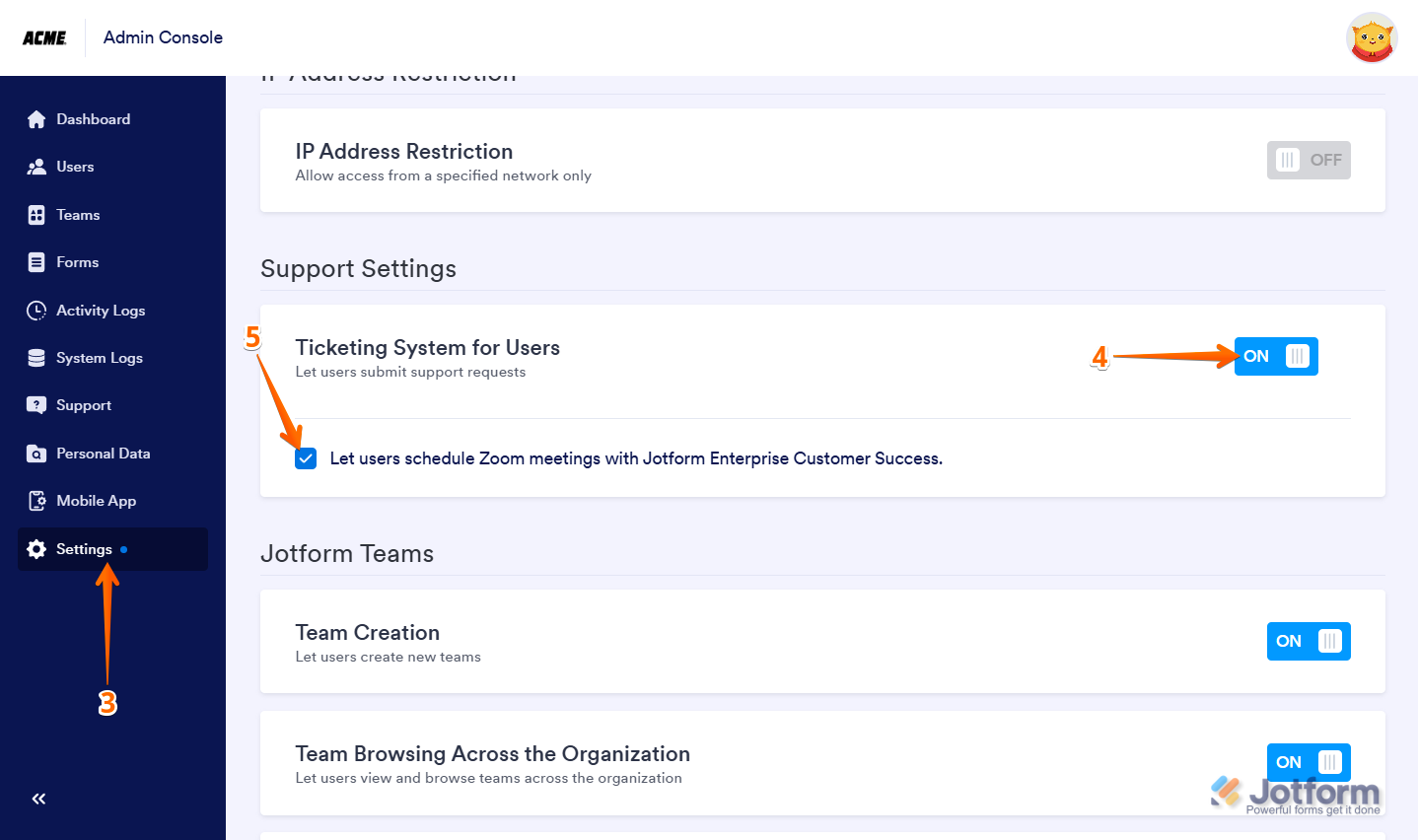 - Now, scroll down to Support Settings and then toggle On the Ticketing System for Users.