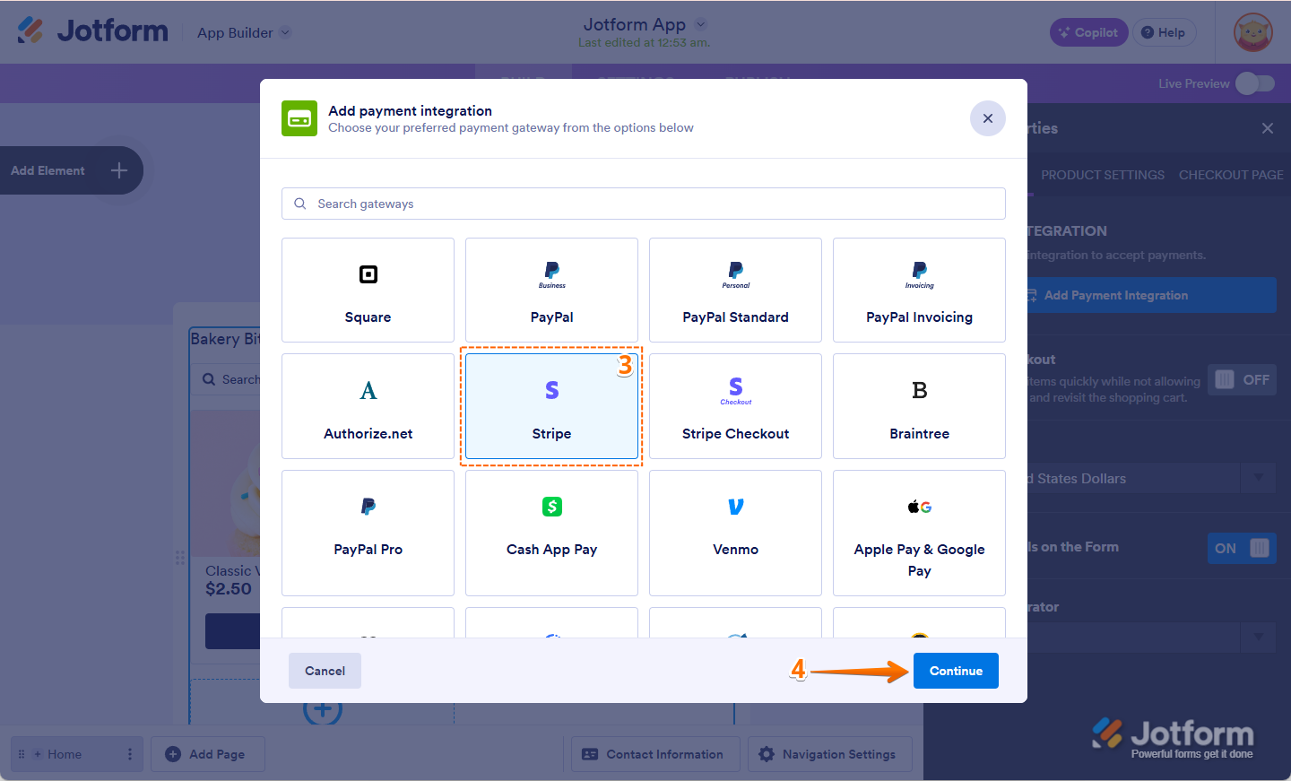 - Now, in the Add Payment Integration window that opens, search for or click on the payment gateway you want to integrate. For example, Stripe.