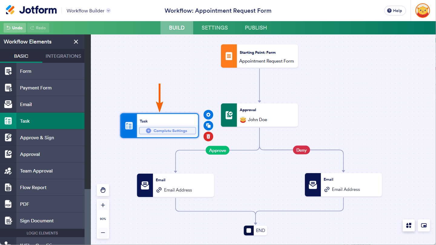 Once you’ve set up the outcomes for your Task element, draw flow lines to and from the Task element to connect it to other elements in the workflow canvas. See How to Add and Connect Elements in Jotform Workflows to learn more.