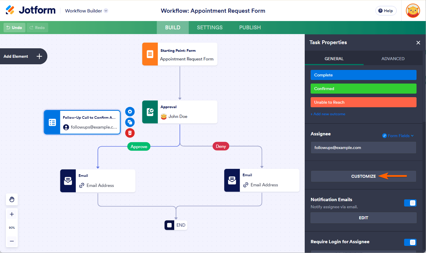 In the Task Properties, click on the Customize button to open the Task Response Form Builder in Workflow Builder.