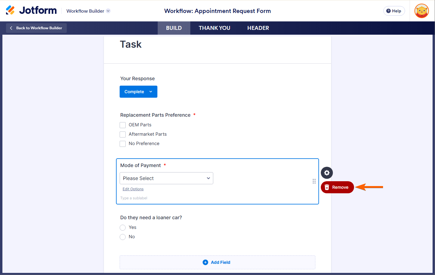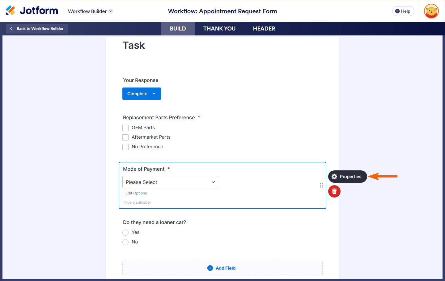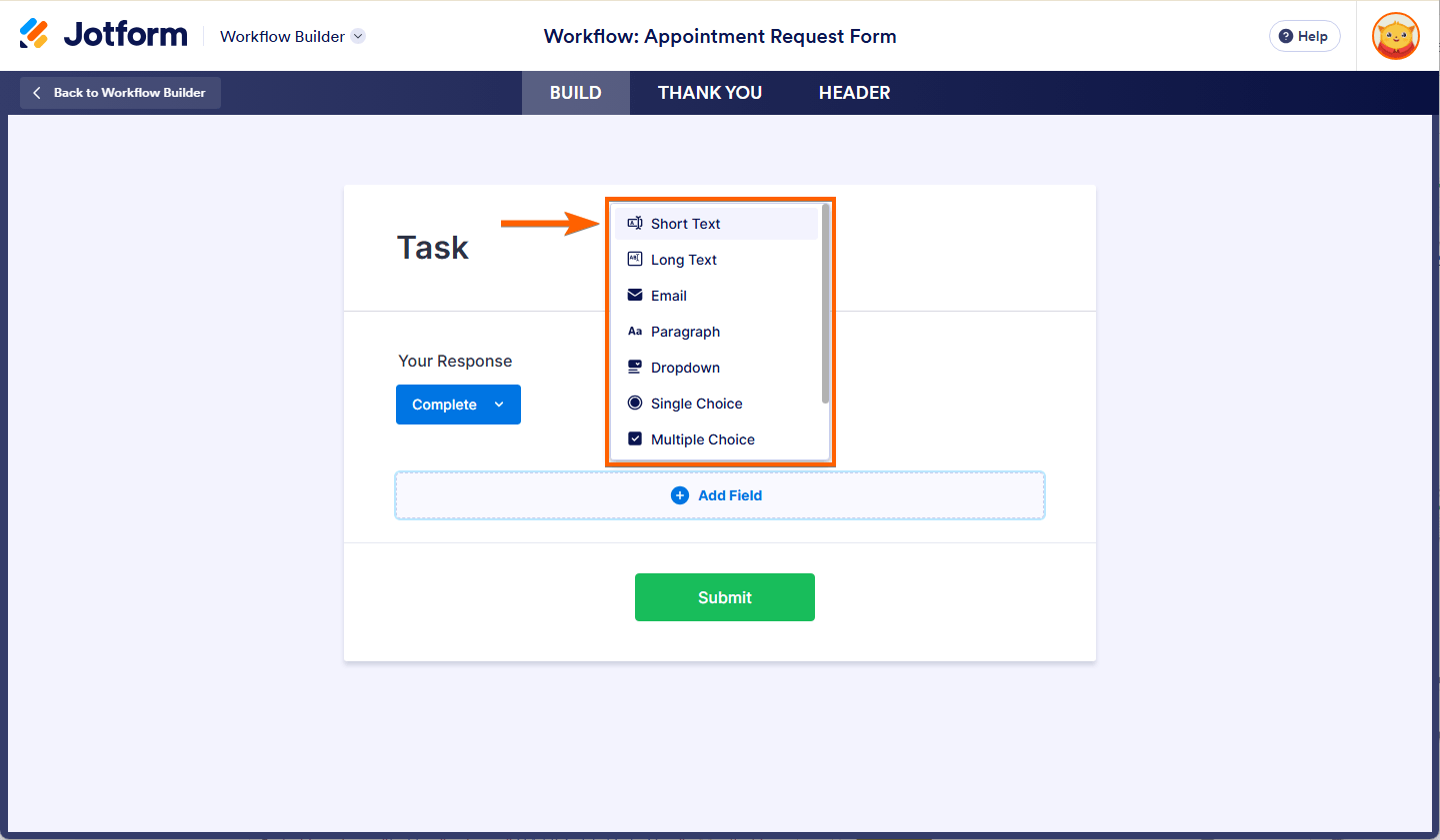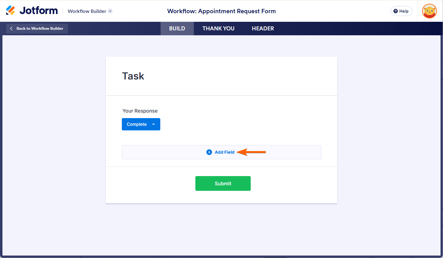 - In the Task Response Form Builder, click on the Add Field button under the Build tab.