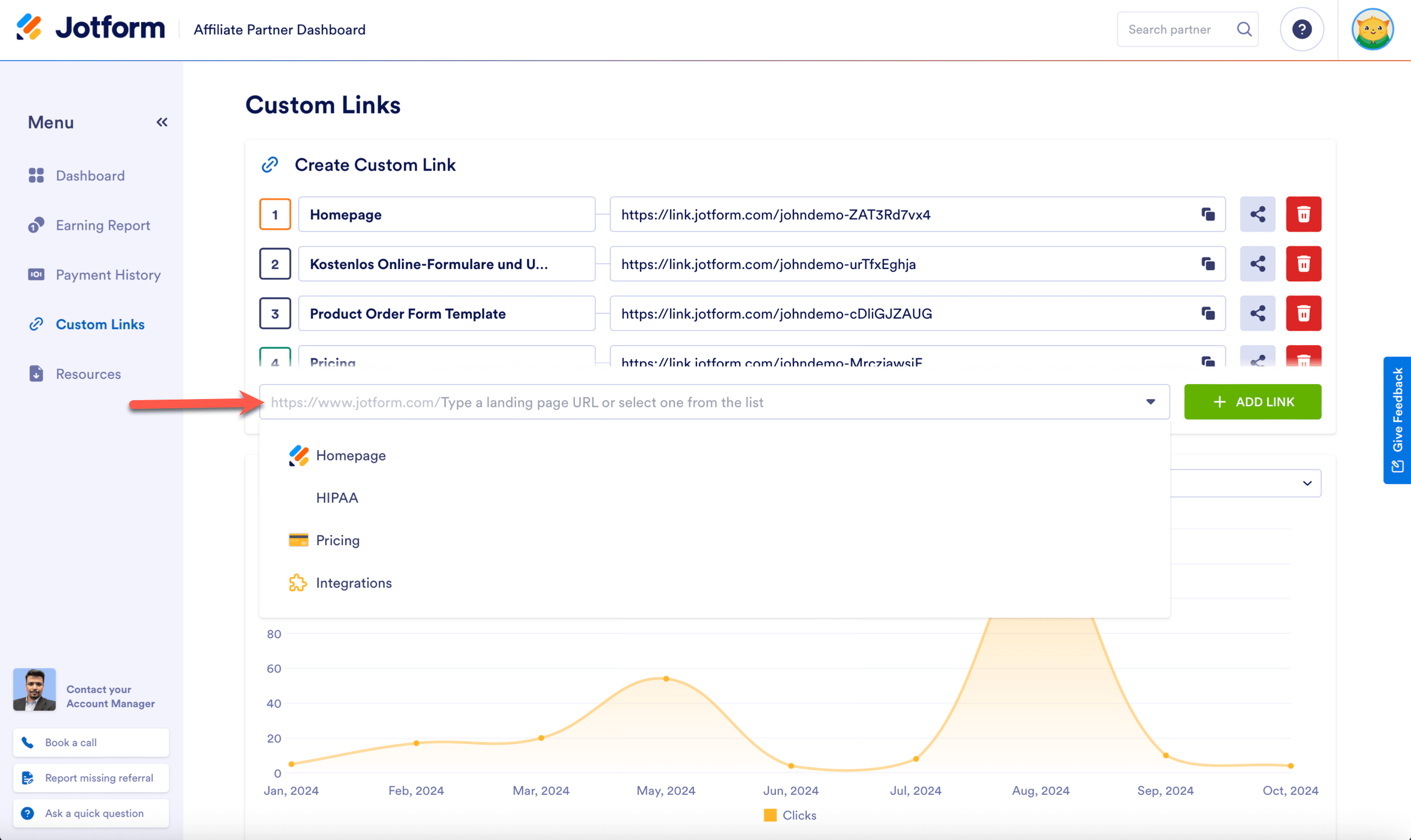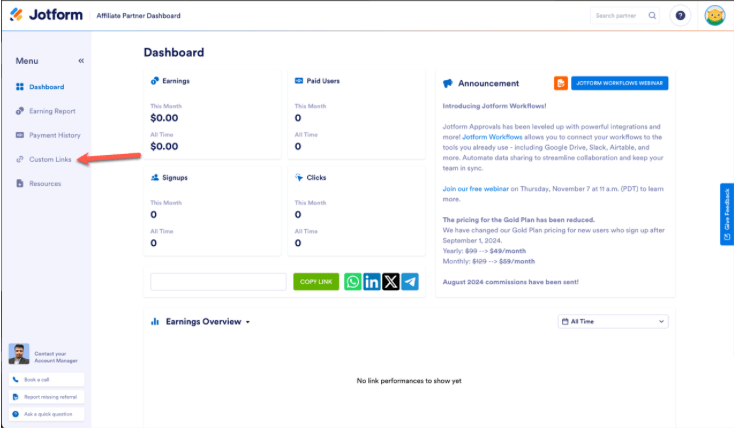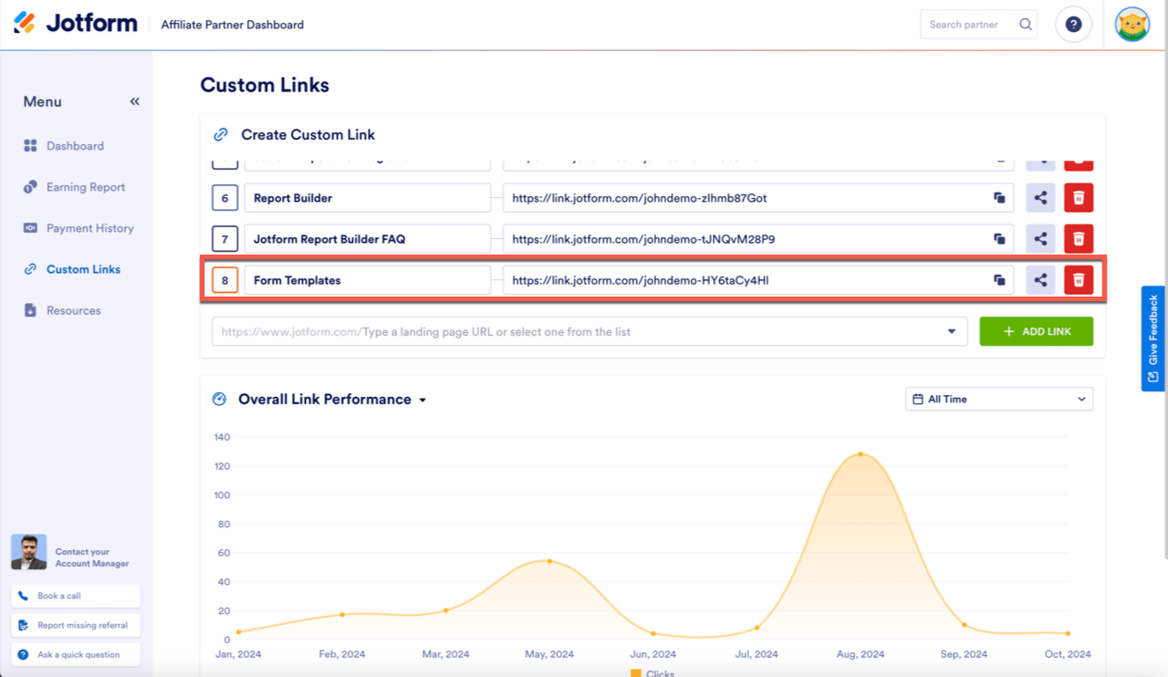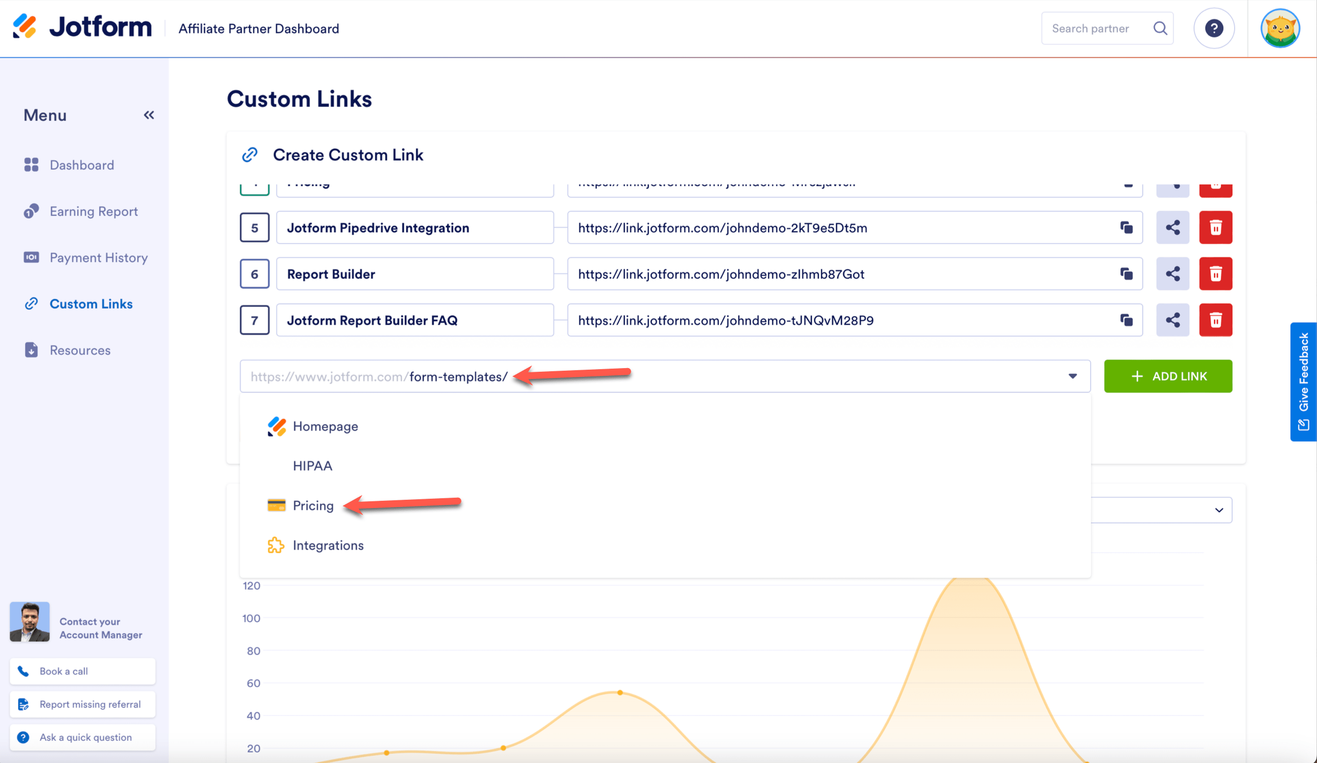 After you get approved for the Jotform Partner Program. You’ll gain access to the Partner Dashboard and you’ll be able to create custom affiliate links. Even if you have a default affiliate link that redirects visitors to the Jotform homepage, you can create different custom affiliate links to redirect visitors to different Jotform pages. This way you can increase your conversion rate by redirecting your target audience to the relevant pages.