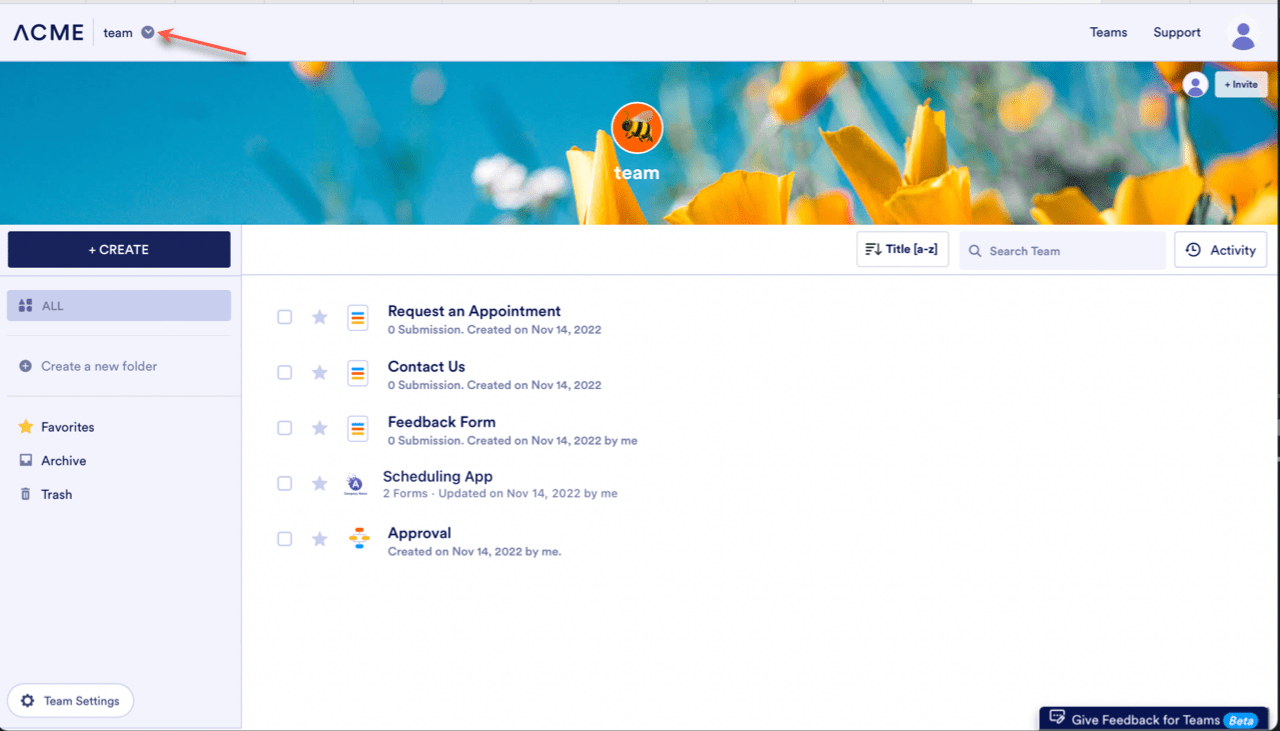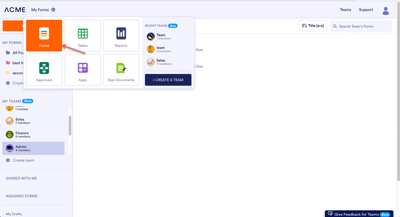 Creating new assets in Jotform Teams allows your team build and manage shared Forms, AI Agents, Workflows, Apps, E-Sign Documents, Tables, Reports, or Boards, all in one central workspace. Whether you’re designing a form or setting up a workflow, Jotform Teams helps keep everything organized and accessible for your whole team.