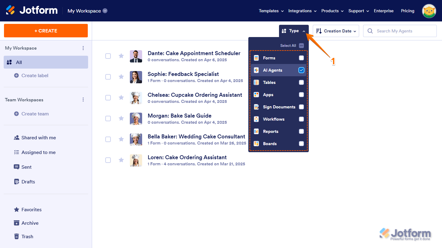 - On your My Workspace page, click on Type at the top and in the Dropdown menu that opens, uncheck the boxes next to all the assets except AI Agents, so only they’ll be shown on the page.
