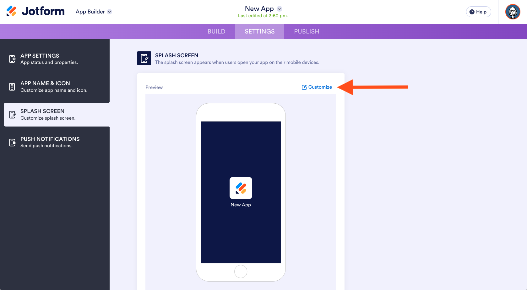 You can personalize the splash screen of your Jotform App. The splash screen is the initial window that appears when someone taps the app icon on their home screen right as it begins to load. Customizing the splash screen enhances your app’s branding, especially by aligning it with your preferred color scheme.