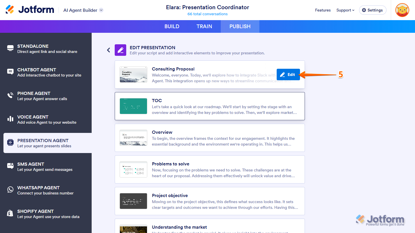 Jotform makes it easy to customize what your Presentation Agent says during your presentation. Editing the narration script helps you match your tone, clarify key messages, and guide your audience more effectively.