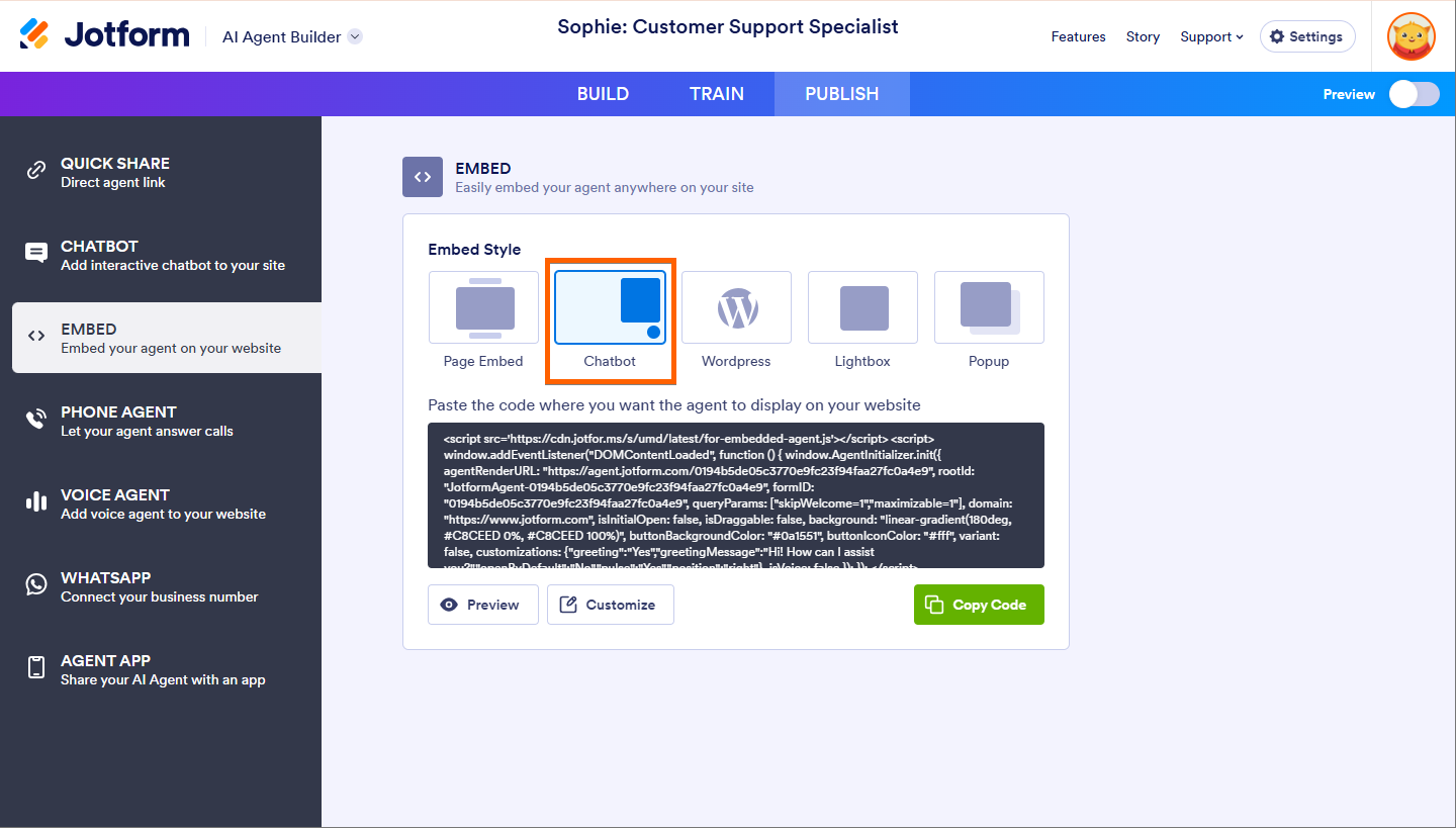 The Page Embed option is the default choice for embedding your AI agent. It directly embeds the AI agent into the page, making it an essential and visible part of your site. To see how it looks before embedding, simply click on the Preview button to test the agent. If you need to make any adjustments, click on the Customize button to further personalize the agent’s appearance.